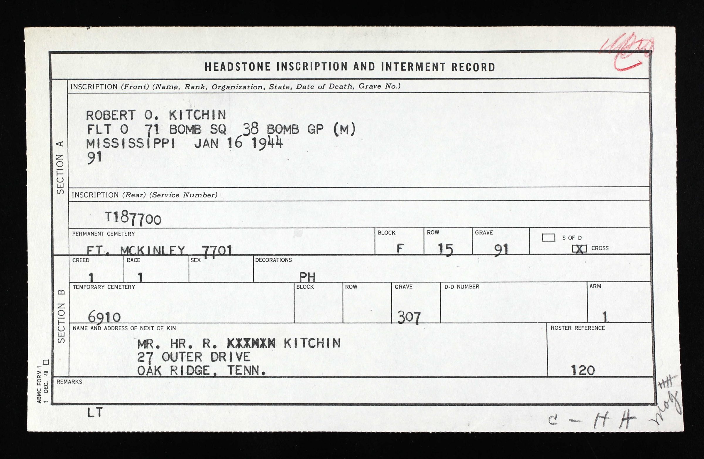 Robert Kitchin was initially buried at USAF Cemetery Finschaffen #1 at British New Guinea and re-buried at Manila American Cemetery, Fort Bonifacio, Manila, Philippines, Plot F, Row 15, Grave 91. He entered the service from Mississippi.