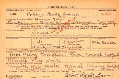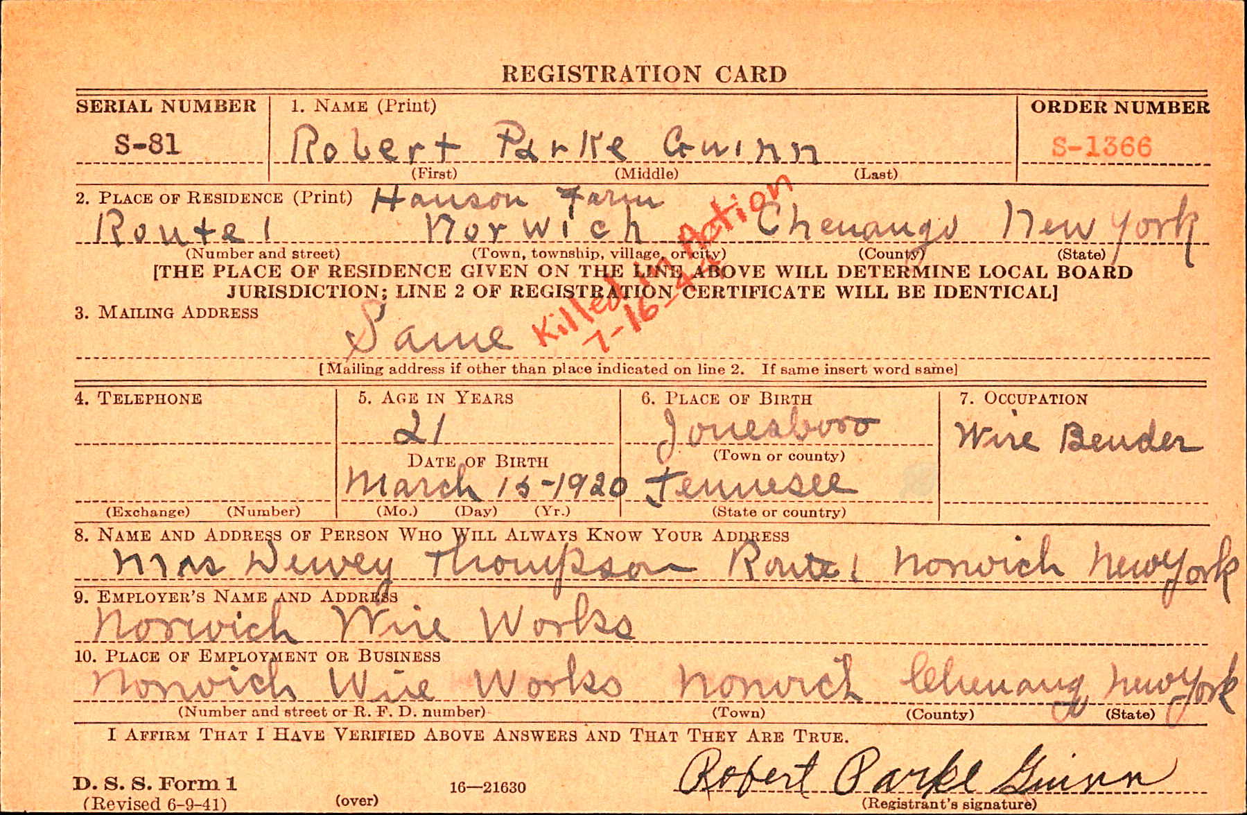 Robert Parke Guinn was born on 15 March 1920 in the Lamar Community of Jonesborough, Washington County, Tennessee. He was lovingly known to his family, friends and school mates as Parke. After his mother’s death in 1929, his father moved the family to Norwich, Chenango County, New York. Robert and his father moved back in the mid-1930s, but the rest of Robert’s siblings stayed in Norwich. His father returned to Norwich where he passed away in 1937. Robert stayed with family here, he attended and graduated Lamar High School, Class of 1941. Robert was very active in school and a favorite of his classmates, they voted him as the class’s Most Handsome & Most Wittiest Boy. He was Captain of the Football team in 1939 and 1940, as Center and was his Senior Year’s Class Vice President and the Yearbook’s Art Editor. Robert also had smarts to go with his athletic prowess and was a member of the Beta Club in 1939, 40 and 41.