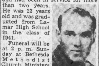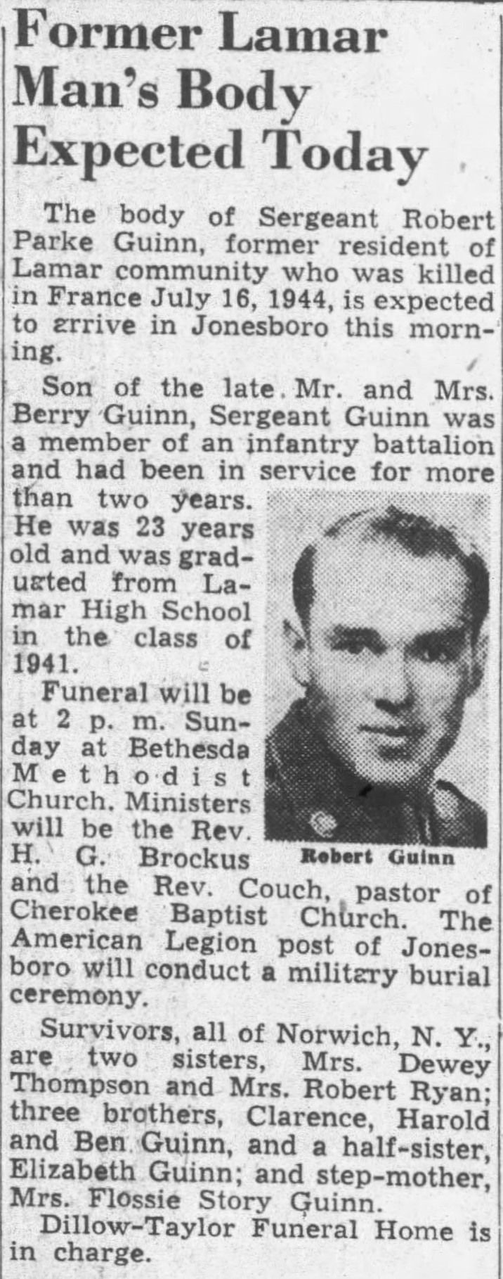 The body of Sergeant Robert Parke Guinn, former resident of Lamar community who was killed in France July 16, 1944, is expected to arrive in Jonesboro this morning. Son of the late Mr. and Mrs. Berry Guinn, Sergeant Guinn was a member of an infantry battalion and had been in service for more than two years. He was 23 years old and was graduated from Lamar High School in the class of 1941. Survivors, all of Norwich, N.Y. are two sisters, Mrs. Dewey Thompson and Mrs. Robert Ryan; three brothers, Clarence, Harold and Ben Guinn and a half-sister, Elizabeth Guinn; and step-mother, Mrs. Flossie Story Guinn.