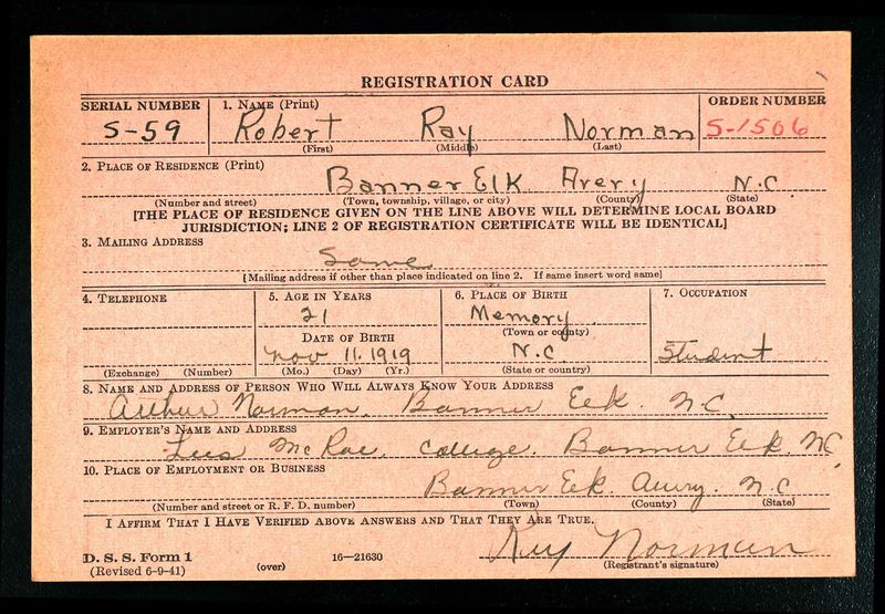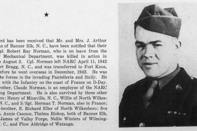 Mr. and Mrs. J. Arthur Norman of Banner Elk, N.C. had been notified that their son, Cpl. Robert Ray Norman, was killed in action in France August 2. Cpl. Norman left NARC April 11, 1942 for FortBragg,N.C. and was transferred to Fort Knox, Ky., before he went overseas in December, 1943. He was with the forces in the invading Pantelleria and Sicily. He landed with the infantry on the coast of France on D-Day. Surviving are four brothers, Claude Norman, Henry Norman, Willie Norman and S/Sgt Herman T. Norman, also in France; a half-brother, E. Richard Eller; five sisters, Annie Cannon, Thelma Bishop, Edna James, Nellie Winters and Flow Aldridge.