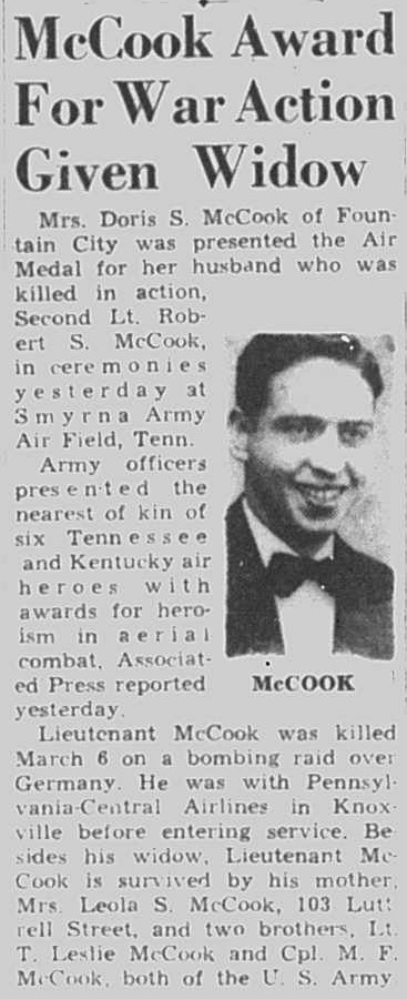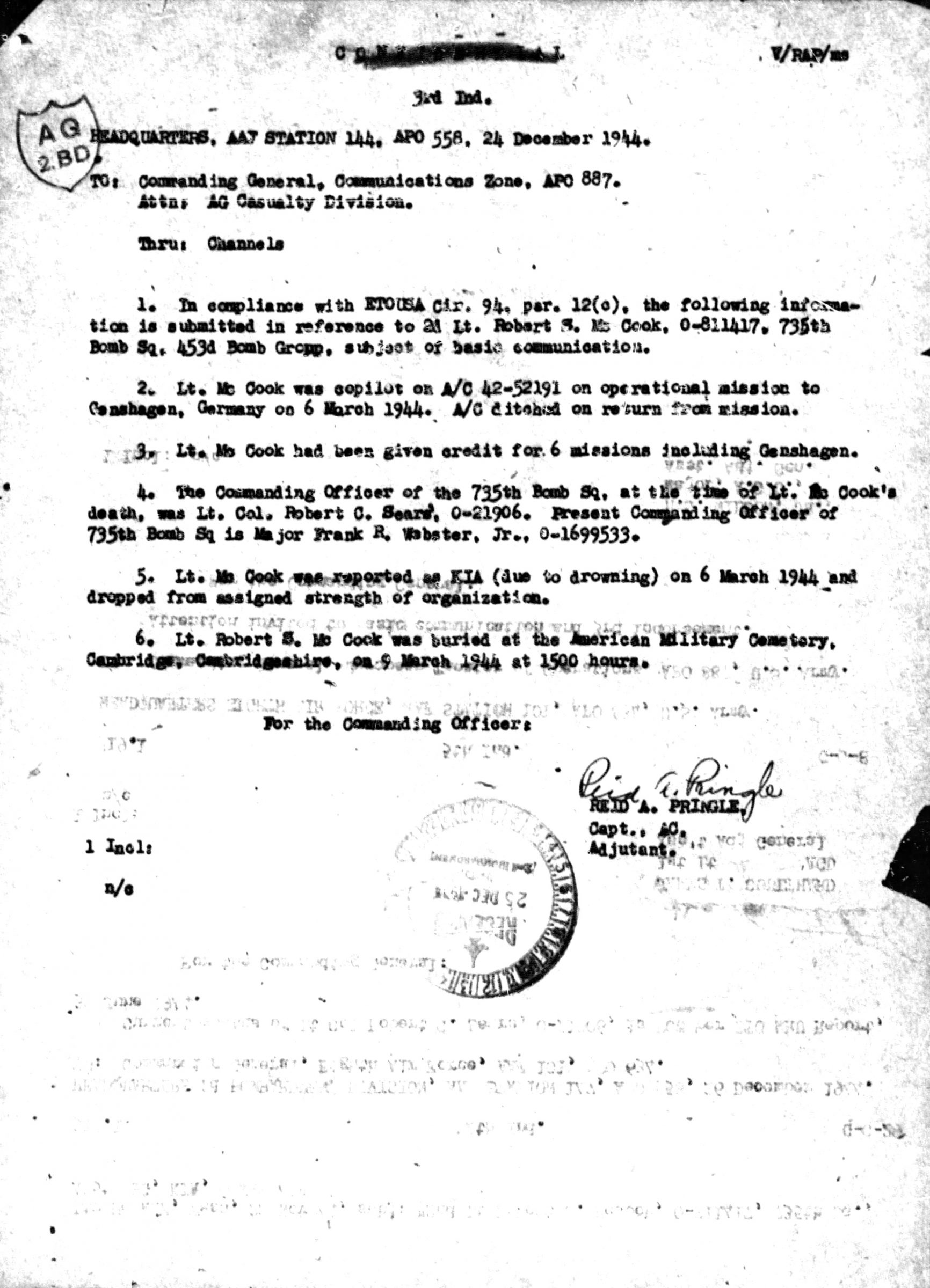 Aircraft B-24H with serial number 42-52191, nickname Lillie Bell, was on a operational mission to Genshagen in Germany. The aircraft ditched in the North Sea on the return flight after being badly damaged. 2nd Lt McCook was reported killed in action due to drowning and was initially buried at the American Military Cemetery, Cambridge, Cambridgeshire, on 9 March 1944 at 1500 hours.