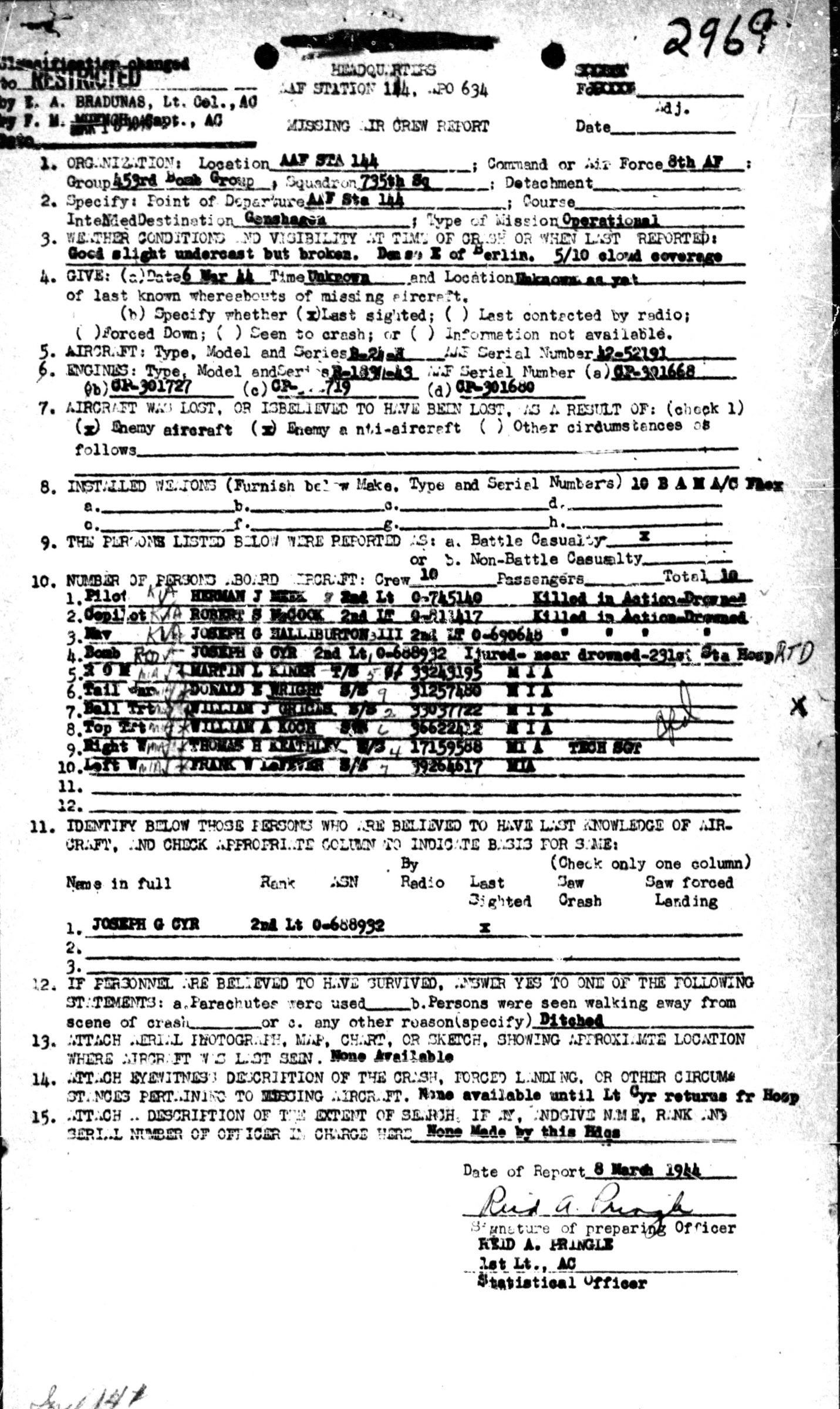- Division/Assignment: 735th Bomber Squadron, 453rd Bomber Group, Heavy