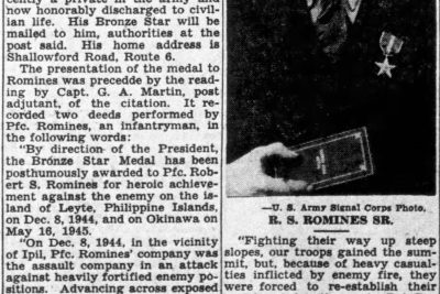 The presentation of the medal to Romines was preceded by the reading by Capt. G.A. Martin, post adjutant, of the citation. It recorded two deeds performed by Pfc. Romines, an infantryman, in the following words; “By direction of the President, the Bronze Star Medal has been posthumously awarded to Pfc. Robert S. Romines for heroic achievement against the enemy on the island of Leyte, Philippine Islands, on Dec. 8, 1944, and on Okinawa on May 16, 1945. On Dec. 8, 1944, in the vicinity of Ipil, Pfc. Romines’ company was the assault company in an attack against heavily fortified enemy positions. Advancing across exposed terrain the company suddenly met extremely heavy enemy machine-gun and rifle fire delivered from carefully camouflaged pillboxes and bunkers. Private Romines’ platoon received the heaviest fire and suffered numerous casualties, necessitating its reorganization.