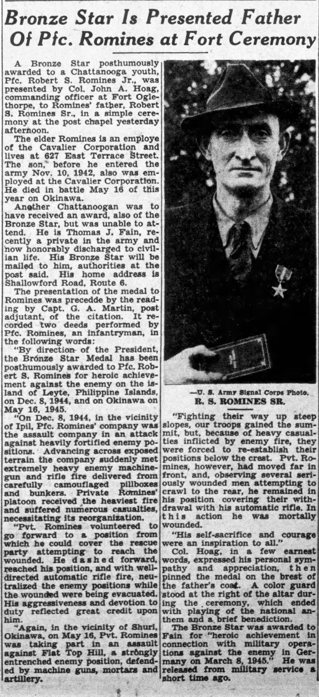 A Bronze Star posthumously awarded to a Chattanooga youth, Pfc. Robert S. Romines, Jr., was presented by Col. John A Hoag, commanding officer at Fort Oglethorpe, to Romines’ father, Robert S. Romines, Sr., in a simple ceremony at the post chapel yesterday afternoon.