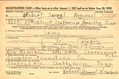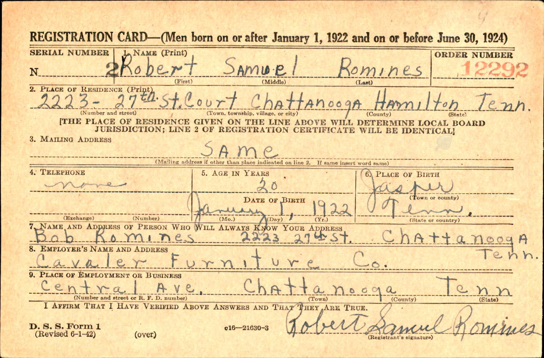 Robert Samuel Romines was born in Jasper, Tennessee to Robert Samuel Romines Sr. and Pollie A. Griffin.