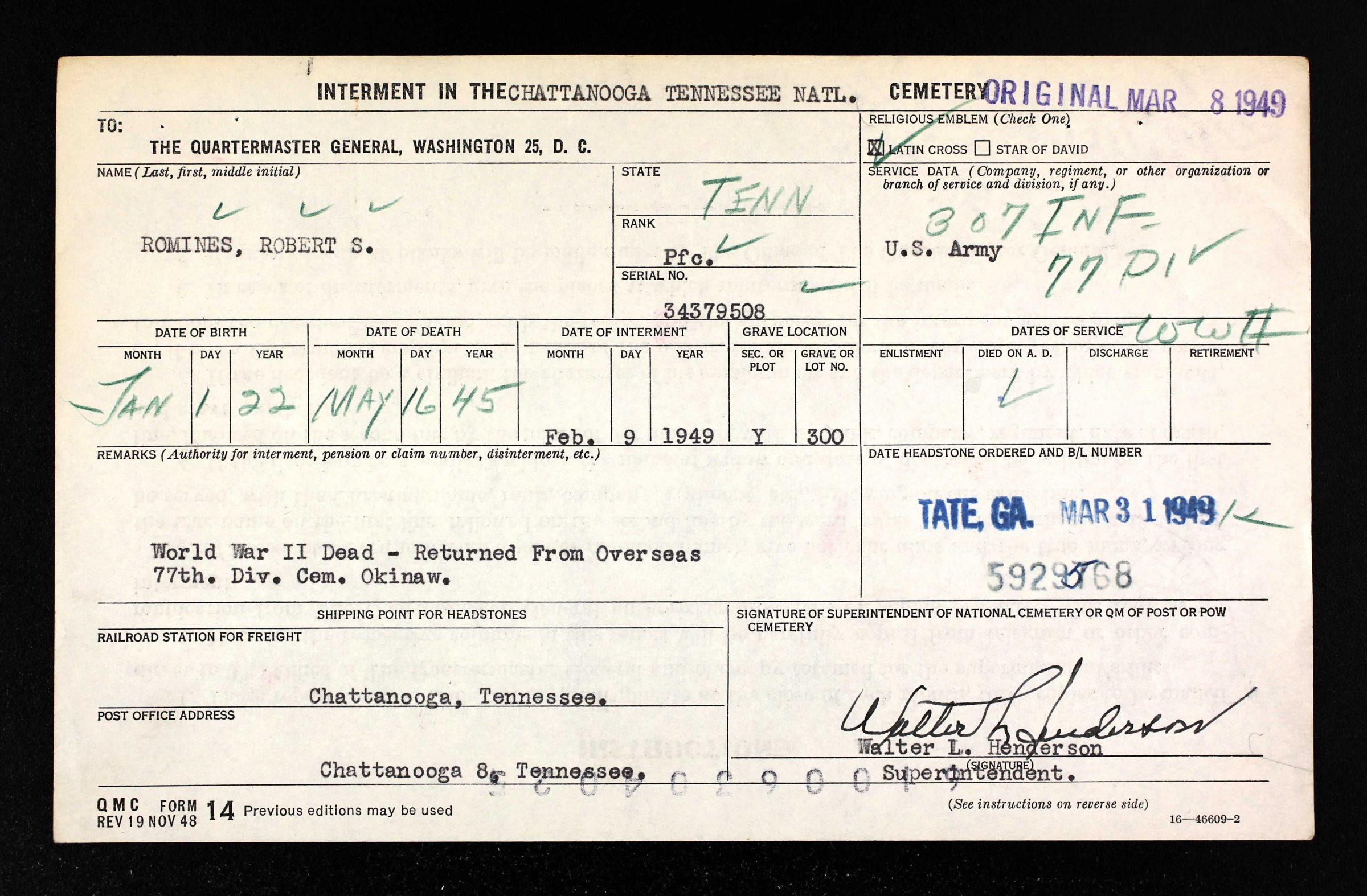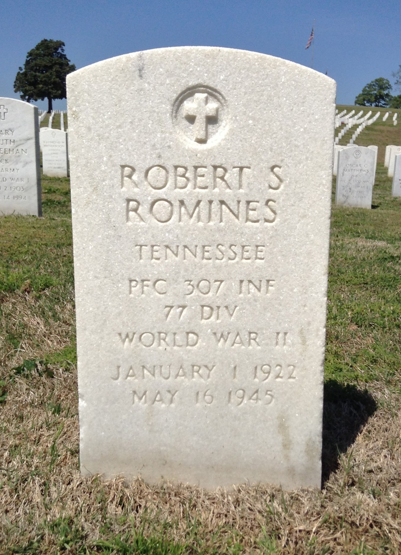 Private First Class Romines had enlisted at Fort Oglethorpe, Georgia on October 27, 1942. He was single, semiskilled in the fabrication of medal, and was a member of the Catholic Church. He was serving with the 307 Infanty Regiment, 77 Infantry Division.
