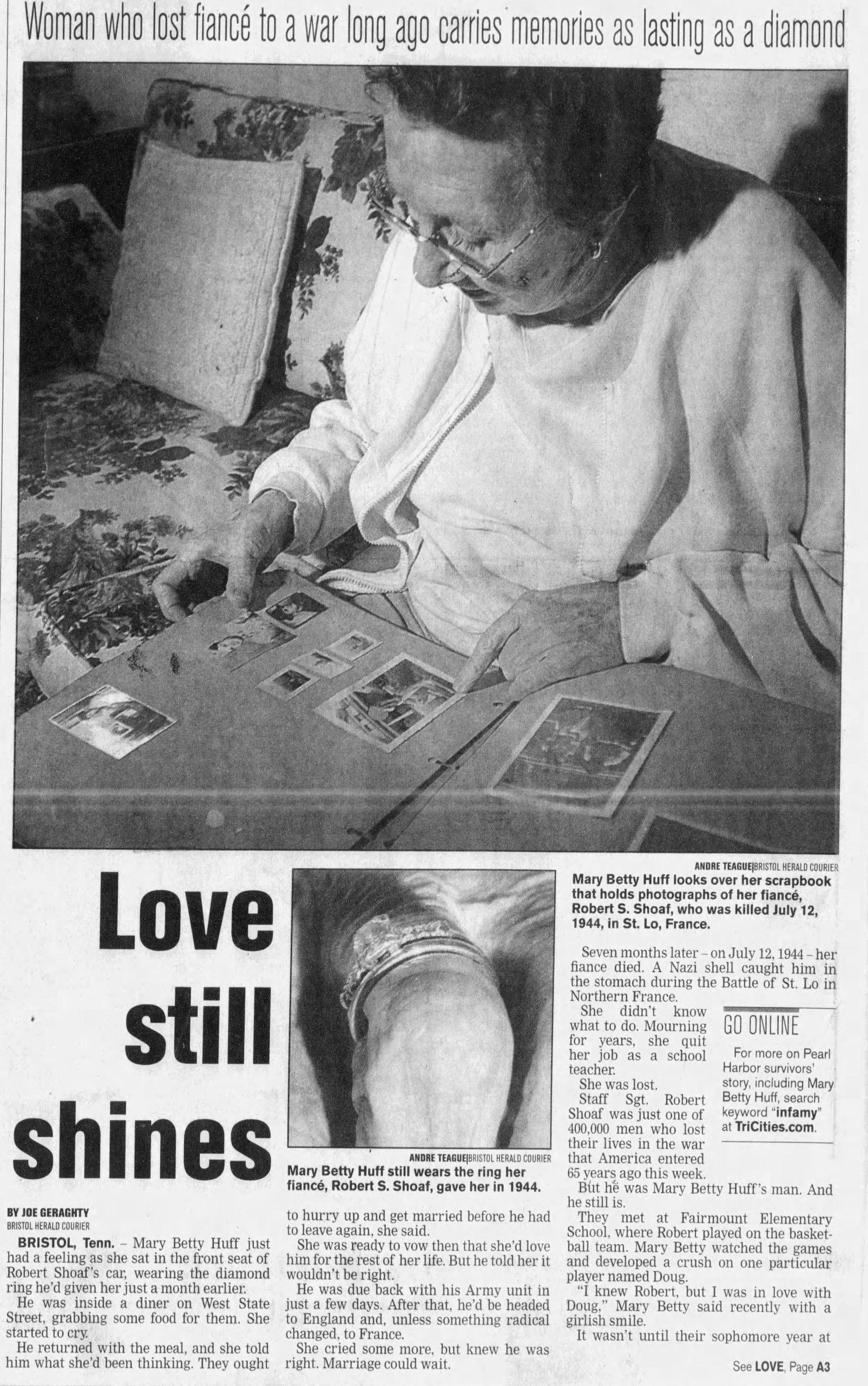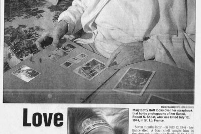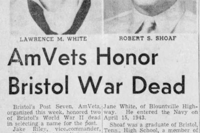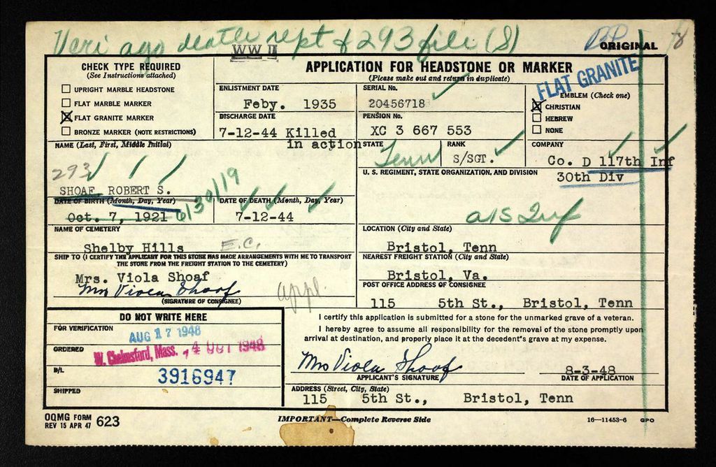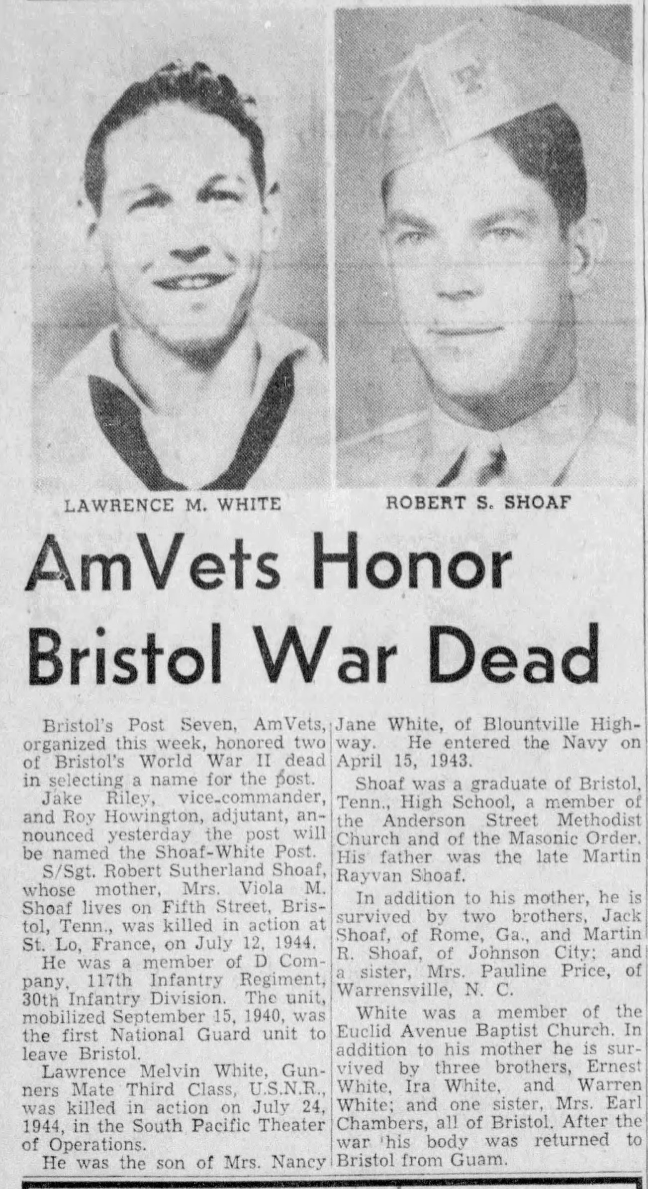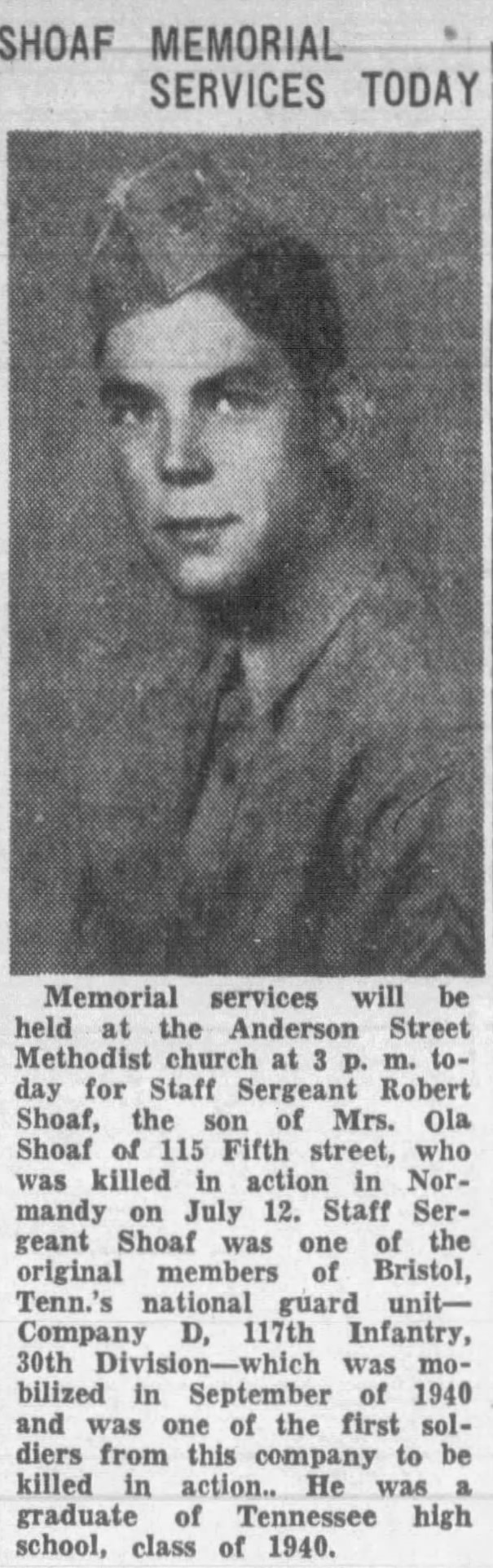Memorial services will be held at the Anderson Street Methodist church for Staff Sergeant Robert Shoaf, the son of Mrs. Ola Shoaf of 115 Fifth street, who was killed in action in Normandy on July 12. Staff Sergeant Shoaf was one of the original members of Bristol, Tenn., national guard unit – Company D, 117t Infantry, 30th Division – which was mobilized in September of 1940 and was one of the fist soldiers from this company to be killed in action. He was a graduate of Tennessee high school, class of 1940.