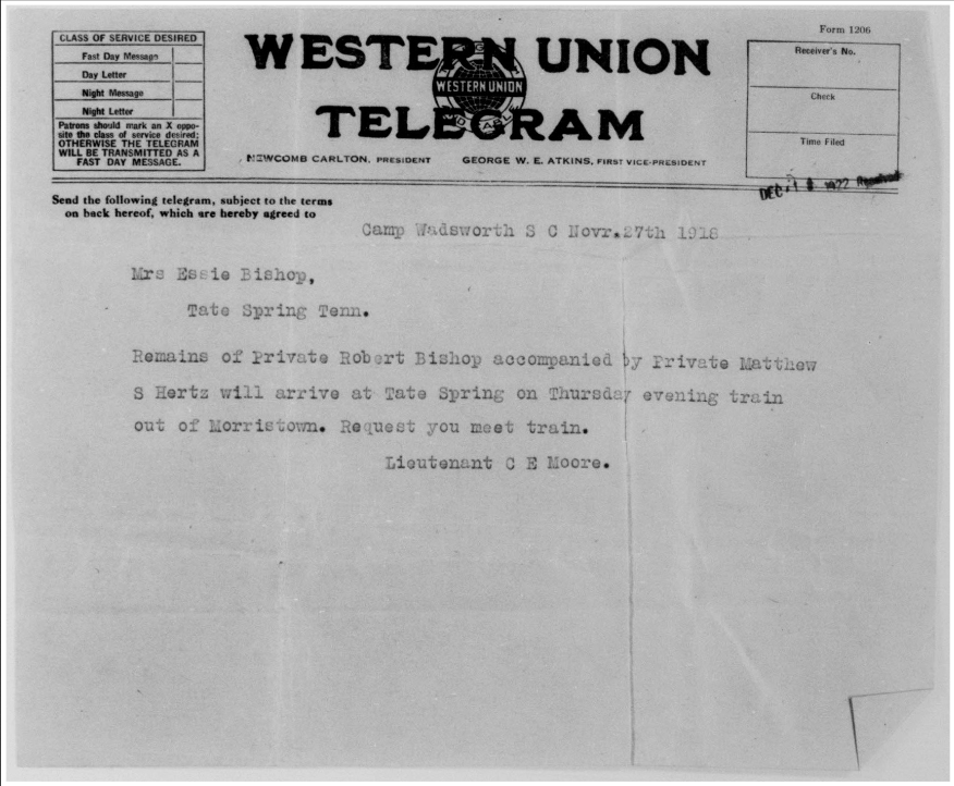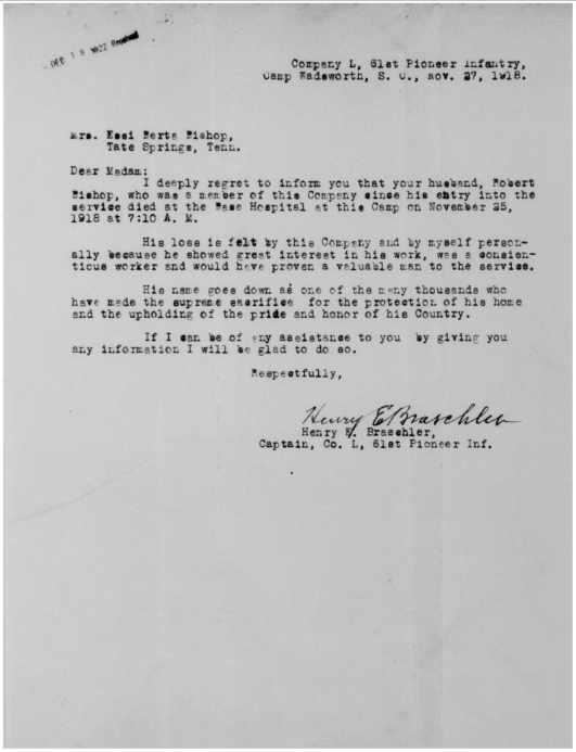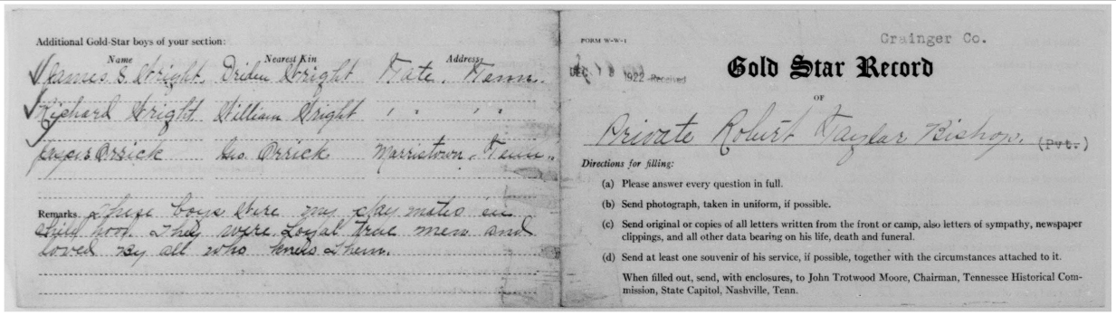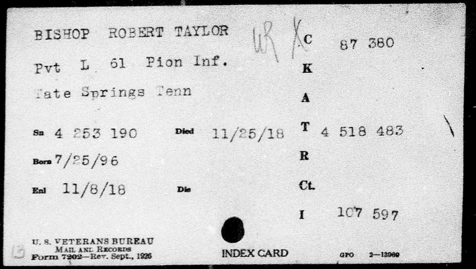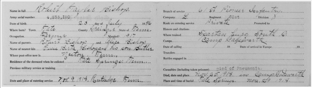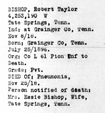 Robert Taylor Bishop was born in 1896 at Tate Springs, Grainger County, TN. He was a farmer before entering the service on 9 November 1918. He trained at Spartanburg, South Carolina and died of pneumonia at Barndollar Commanding Hospital at Camp Wadsworth, Spartanburg, SC. He was buried 29 November 1918.