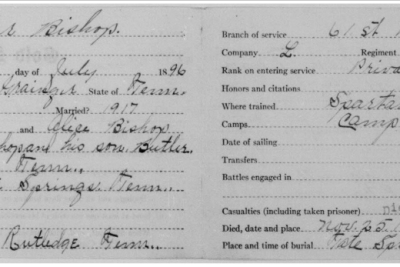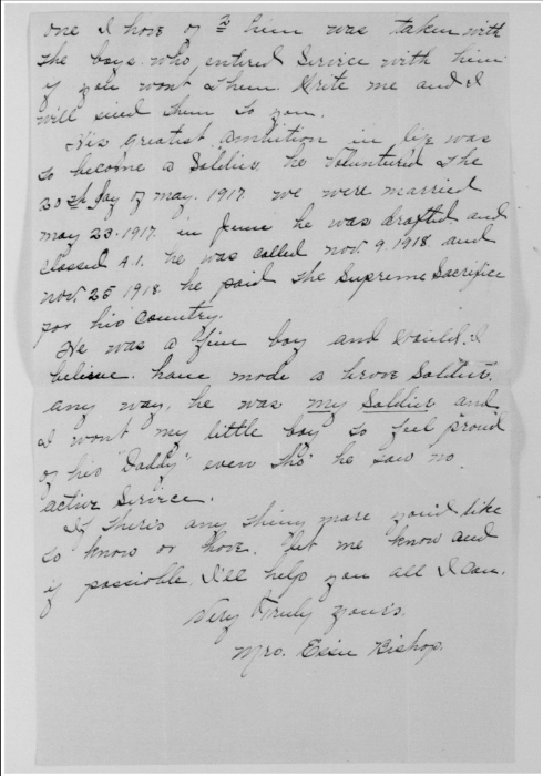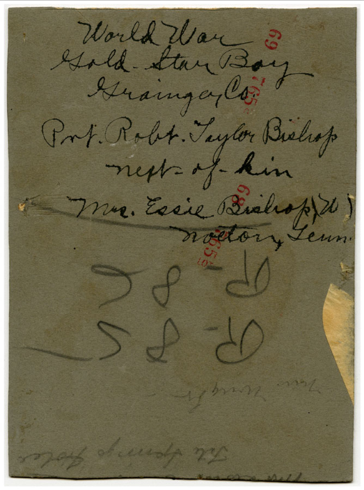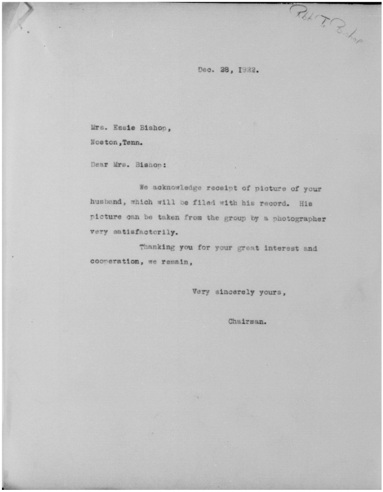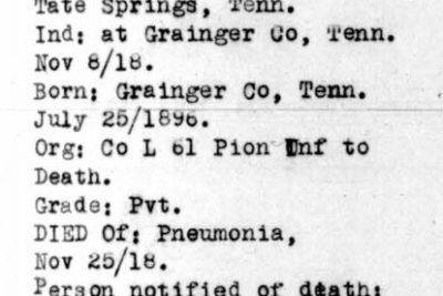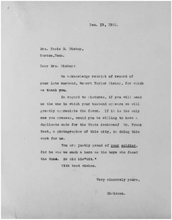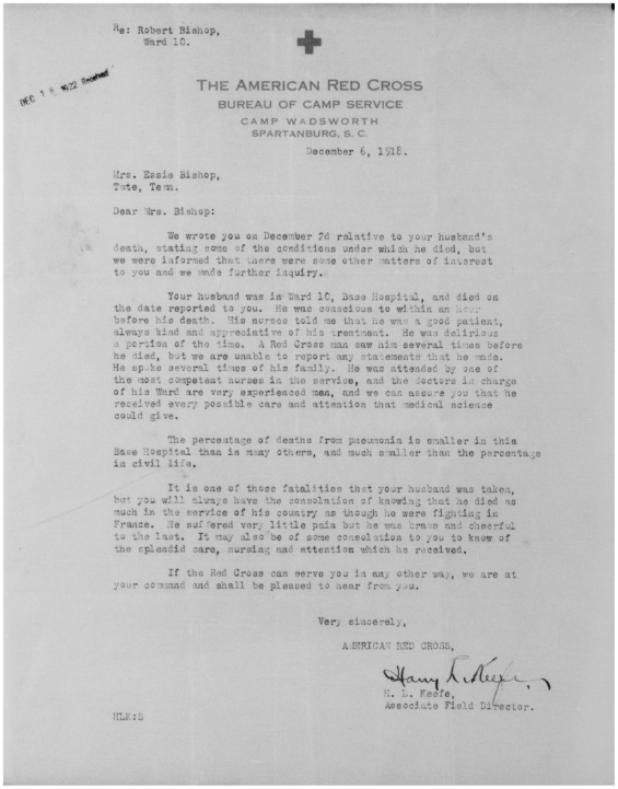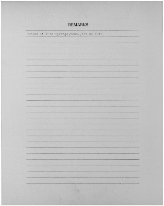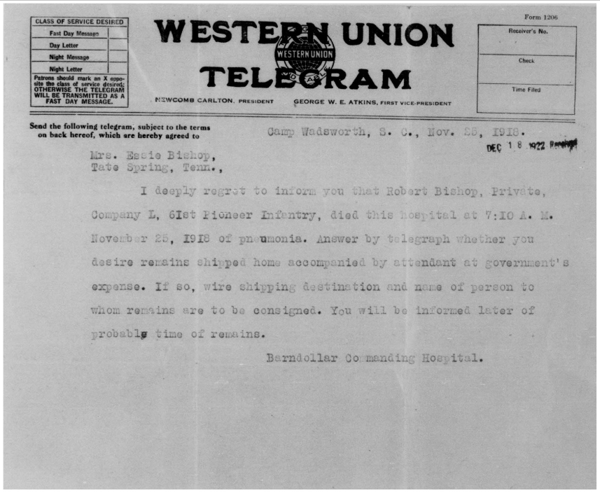 Robert Taylor Bishop was born in 1896 at Tate Springs, Grainger County, TN. He was a farmer before entering the service on 9 November 1918. He trained at Spartanburg, South Carolina and died of pneumonia at Barndollar Commanding Hospital at Camp Wadsworth, Spartanburg, SC. He was buried 29 November 1918.