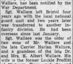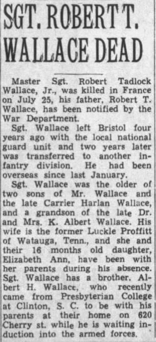 Master Sgt. Robert Tadlock Wallace Jr., was killed in France on July 25, his father, Robert T. Wallace, has been notified by the War Department. Sgt. Wallace left Bristol four years ago with the local national guard unit and two years later was transferred to another infantry division. He had been overseas since last January. Sgt. Wallace was the older of two sons of Mr. Wallace and the late Carrier Harlan Wallace, and a grandson of the late Dr. and Mrs. K. Albert Wallace. His wife is the former Luckle Proffitt of Watauga, Tenn., and she and their 16 months old daughter, Elizabeth Ann, have been with her parents during the absence. Sgt. Wallace has a brother, Albert H. Wallace, who recently came from Presbyterian College at Clinton, S.C. to be with his parents at their home on 620 Cherry St. while he is waiting induction into the armed forces.