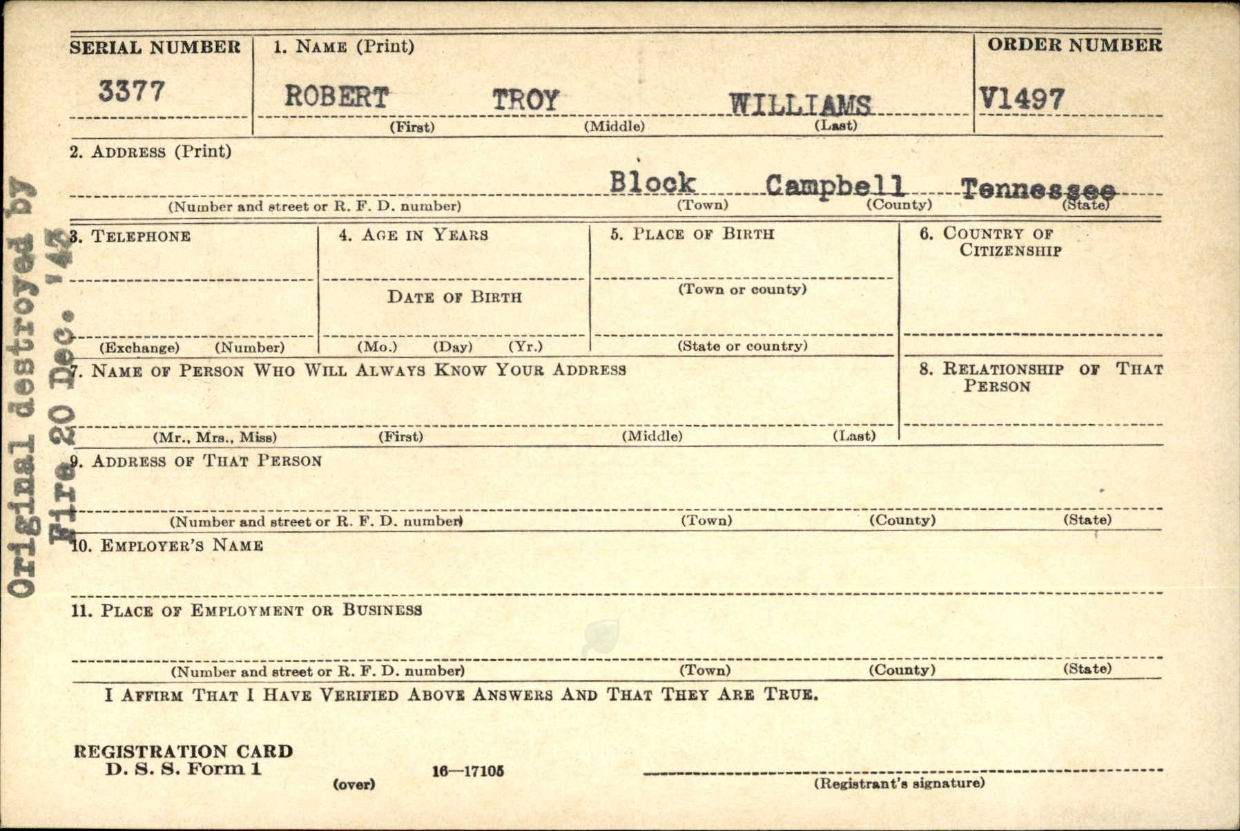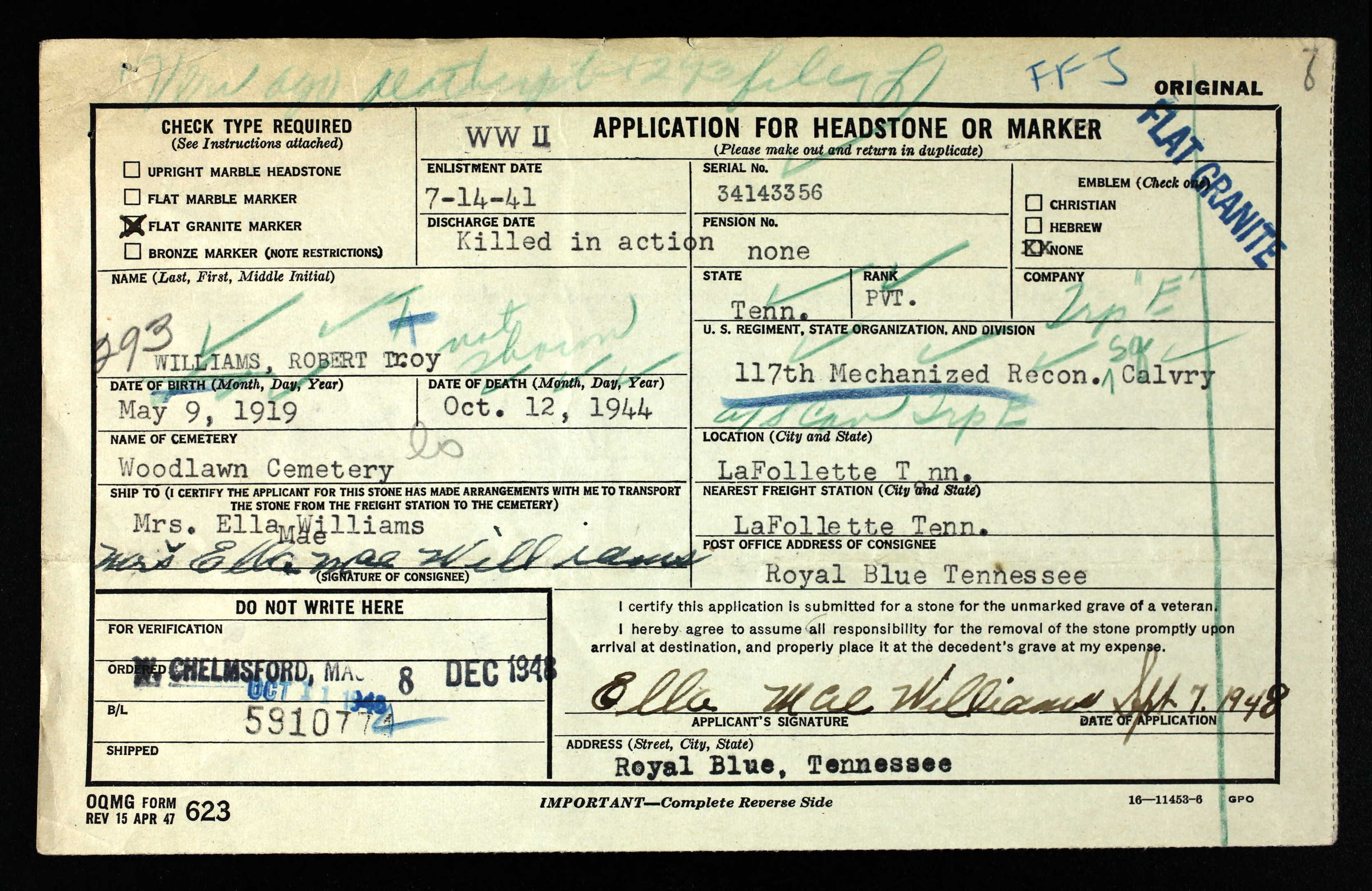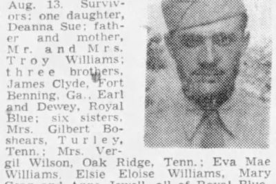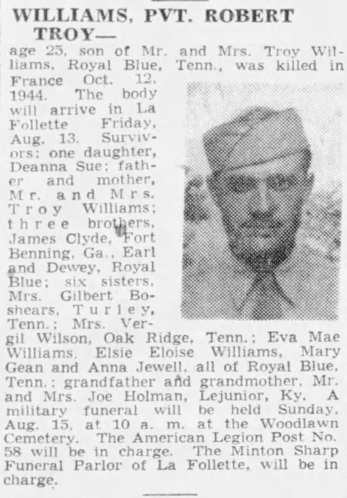 Robert Troy Williams, age 25, son of Mr. and Mrs. Troy Williams, Royal Blue, Tenn., was killed in France Oct. 12, 1944. The body will arrive in La Follette August 13. Surviving; one daughter, Deanna Sue; father and mother, Mr. and Mrs. Troy Williams; three brothers, James Clyde, Fort Benning, Ga., Earl and Dewey, Royal Blue; six sisters, Mrs. Gilbert Boshears, Turley, Tenn.; Mrs. Vergil Wilson, Oak Ridge, Tenn.; Eva Mae Williams, Elsie Eloise Williams, Mary Gean and Anna Jewell, all of Royal Blue, Tenn.; grandfather and grandmother, Mr. and Mrs. Joe Holman, Lejunior, Ky. A military funeral will be held Aug. at the Woodlawn Cemetery.