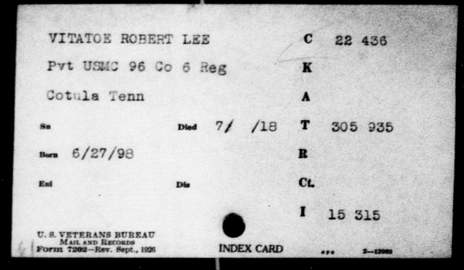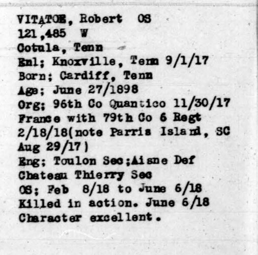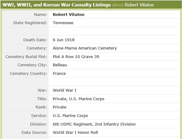 Robert Vitatoe was killed in action on 6 June 1918 by enemy shell-fire in an attack on the town of Bouresches, Aisne, France. He served with the 6th Marines, 2nd Infantry Division. He is buried at Aisne-Marne Cemetery, France (A, 10, 39).
