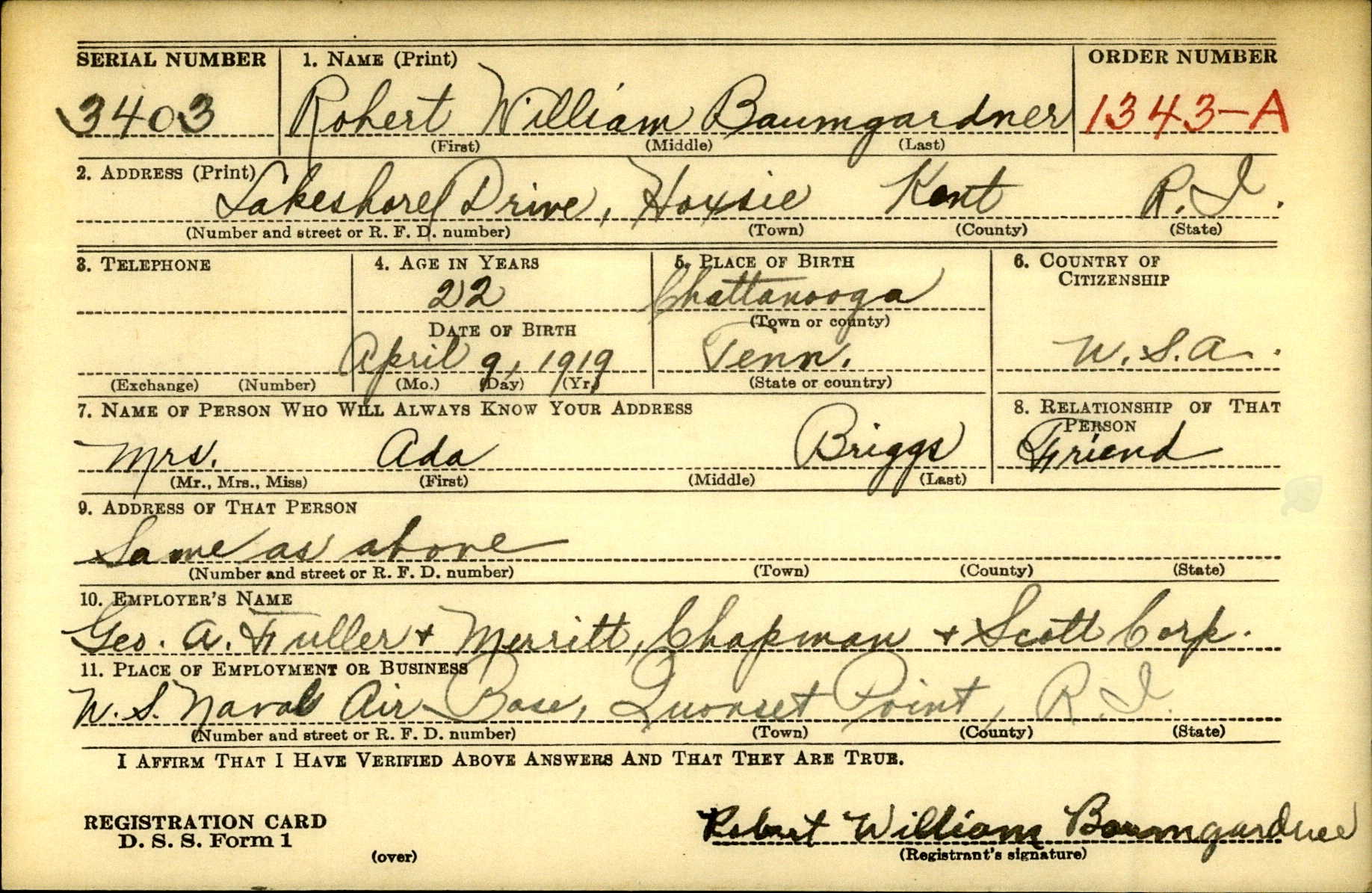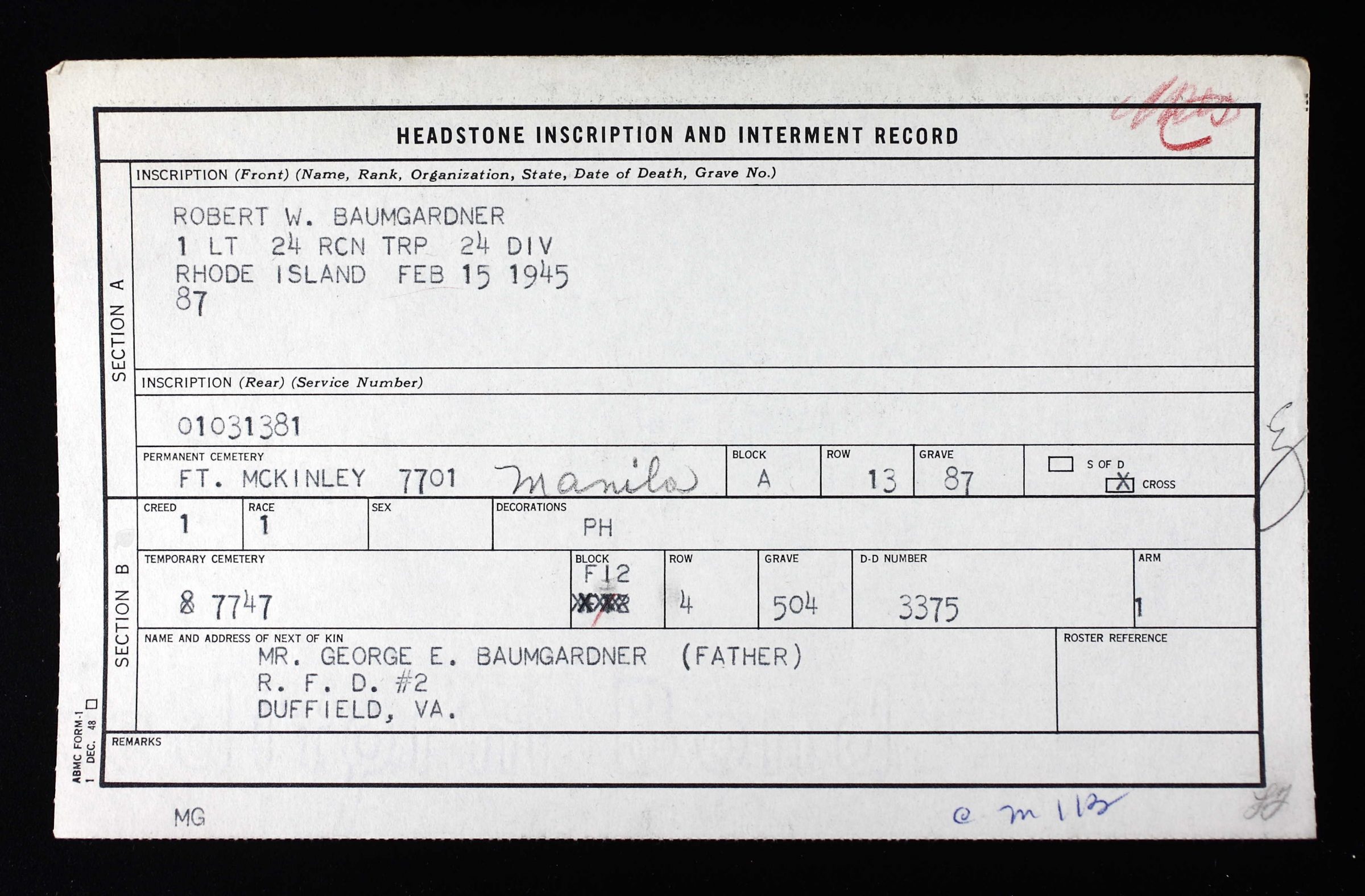1st Lt Robert Baumgardner was a resident of Kent County, Rhode Island