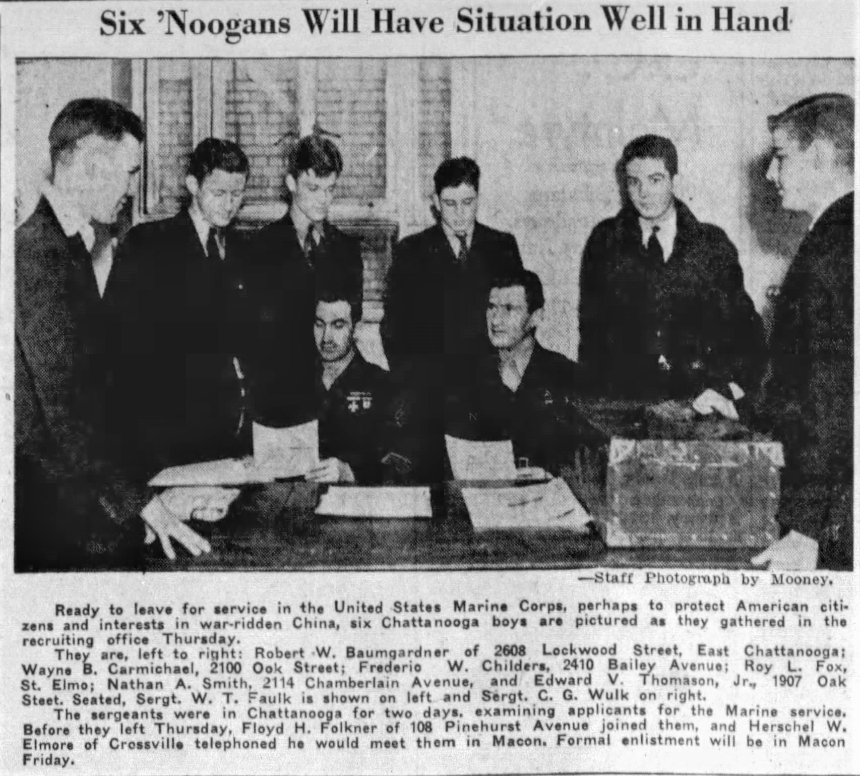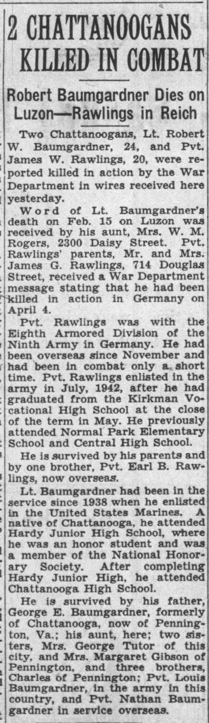 Lt. Robert W. Baumgardner, 24 was reported killed in action by the War Department. Word of Lt. Baumgardner’s death on Feb. 15 on Luzon was received by his aunt, Mrs. W.M. Rogers, 2300 Daisy Street. Lt. Baumgardner had been in the service since 1938 when he enlisted in the United States Marines. A native of Chattanooga, he attended Hardy Junior High School, where he was an honor student and was a member of the National Honorary Society. After completing Hardy Junior High, he attended Chattanooga High School.