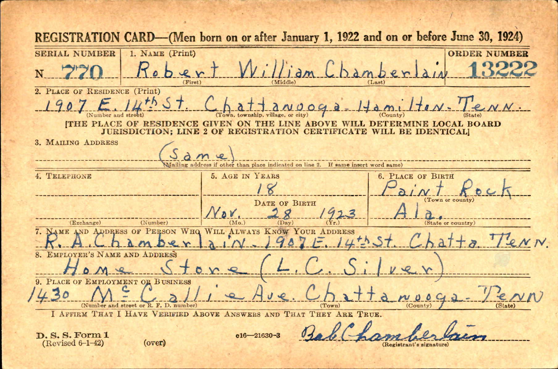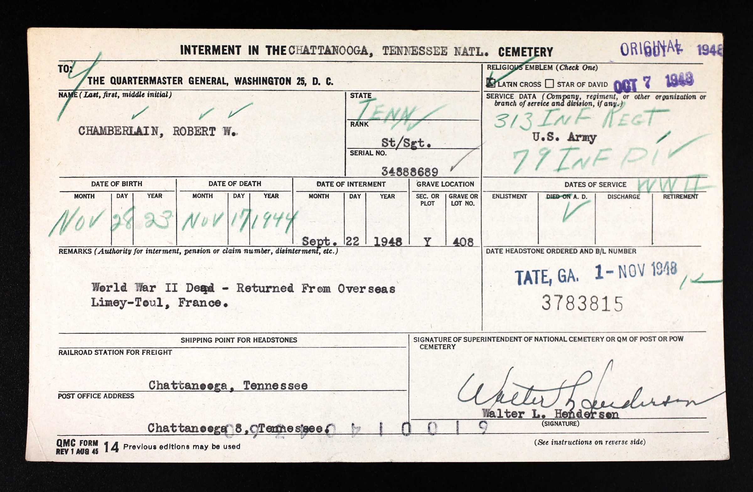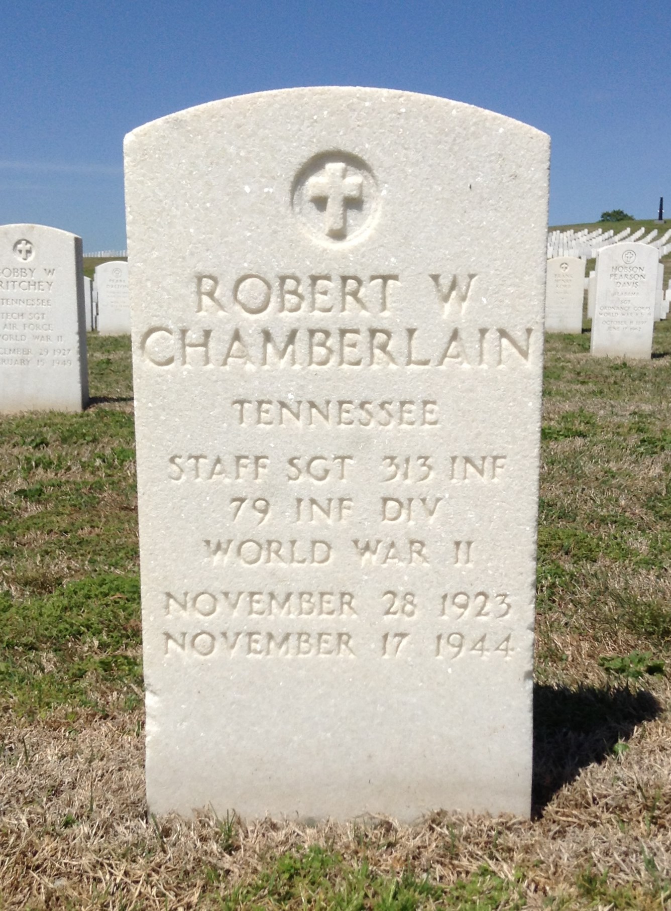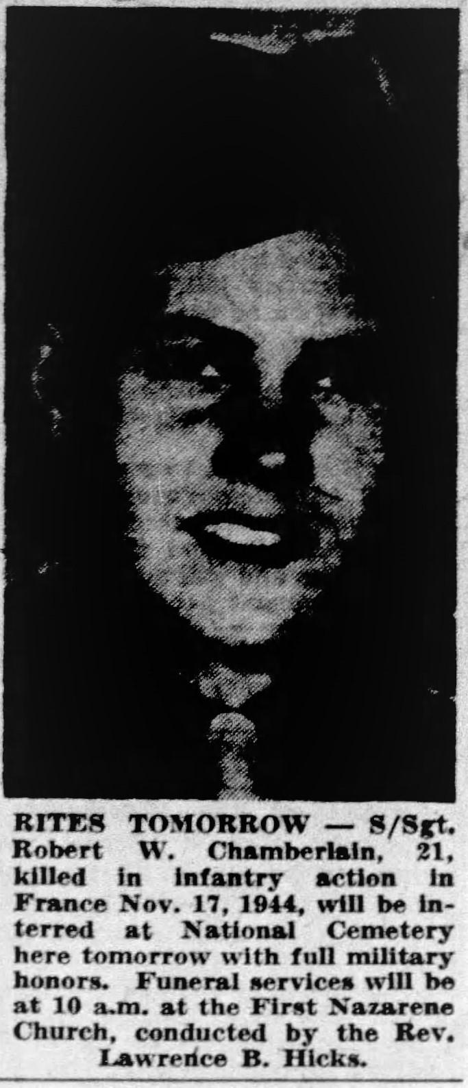 The body of S/Sgt Robert W. Chamberlain, 21, who was killed in action while serving as an infantryman in France Nov. 17, 1944, will arrive for final interment in the National Cemetery. Sgt. Chamberlain, a graduate of Central High School, was the son of Mr. and Mrs. Robert A. Chamberlain of Lakeview, Ga. He was the brother of Albert B. Chamberlain, Floyd Chamberlain and Miss Angeline Chamberlain. He was a member of the First Nazarene Church here.
