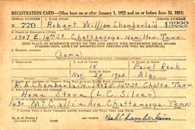 Robert William “Bob” Chamberlain was born on 28 November 1923 at Paint Rock, Alabama, the son of Robert Alexander Chamberlain and Mary Ella Wells.