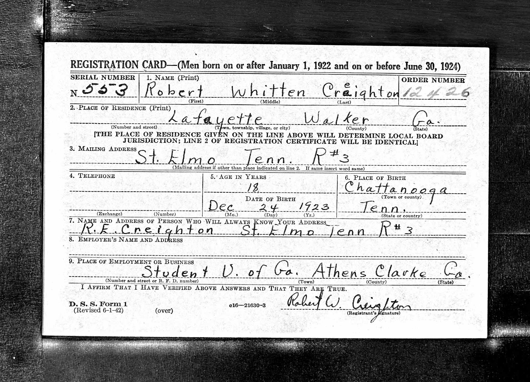 Missing in action is Sgt. Robert W. Creighton, 22, son of Mr. and Mrs. R.E. Creighton, Chattanooga Valley. Sgt. Creighton was reported missing in air action in Czechoslovakia March 24, the War Department notified his parents. A graduate of Chattanooga High School, he volunteered for service in April, 1943, while a student at the University of Georgia. He received his wings in December, 1943, and was assigned to overseas duty one year later. A brother of Mrs. Evelyn Cutts, Jefferson, Ga., and T5 W.E. Creighton, with the army in Germany, Sgt Creighton was assigned to a 15th Air Force Liberator group as waist gunner. He is a nephew of Mrs. Evie Moser and Mrs. W.C. Smith, Interstate Apartments.