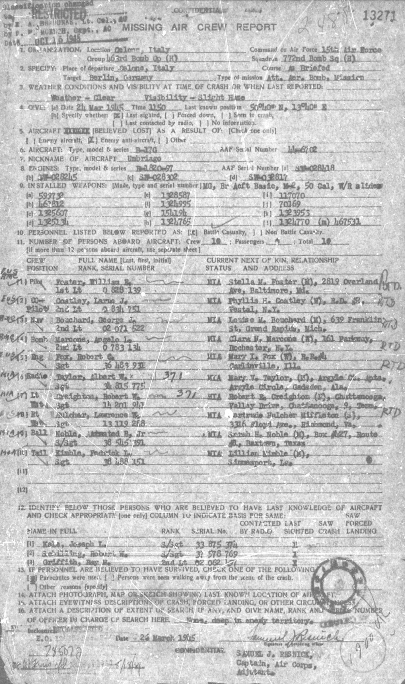 Aircraft B-17G with serial number 44-6702 departed from Calone, Italy on an aerial bombing mission to Berlin, Germany. The aircraft left the formation north of Crux, Czechoslovakia. According to the surviving crew members, Robert Creighton didn’t bail out as he was pinned to the floor because of the spin that the plane was in. Sgt Creighton was taken prisoner of war by the Germans and died the same day. He had completed 9 missions.
