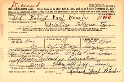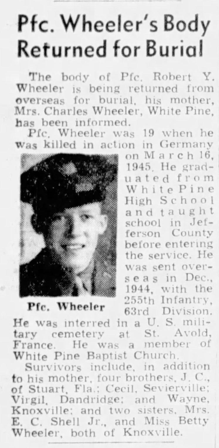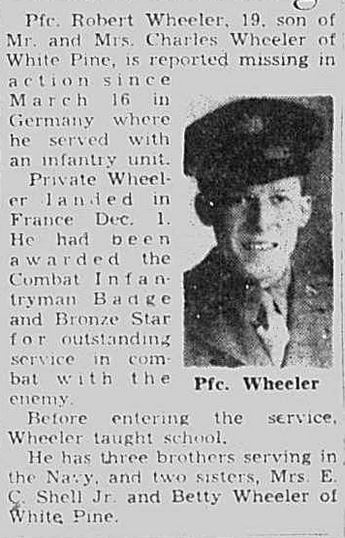 Pfc Wheeler landed in France December 1. He had been awarded the Combat Infantryman Badge and Bronze Star for outstanding service in combat with the enemy. PFC Wheeler was killed in action 16 March 1945 near Saarbrucken, Germany. He is buried at White Pine Cemetery, Jefferson County, Tennessee.