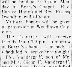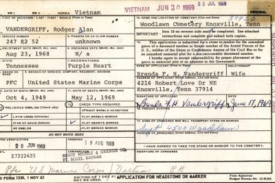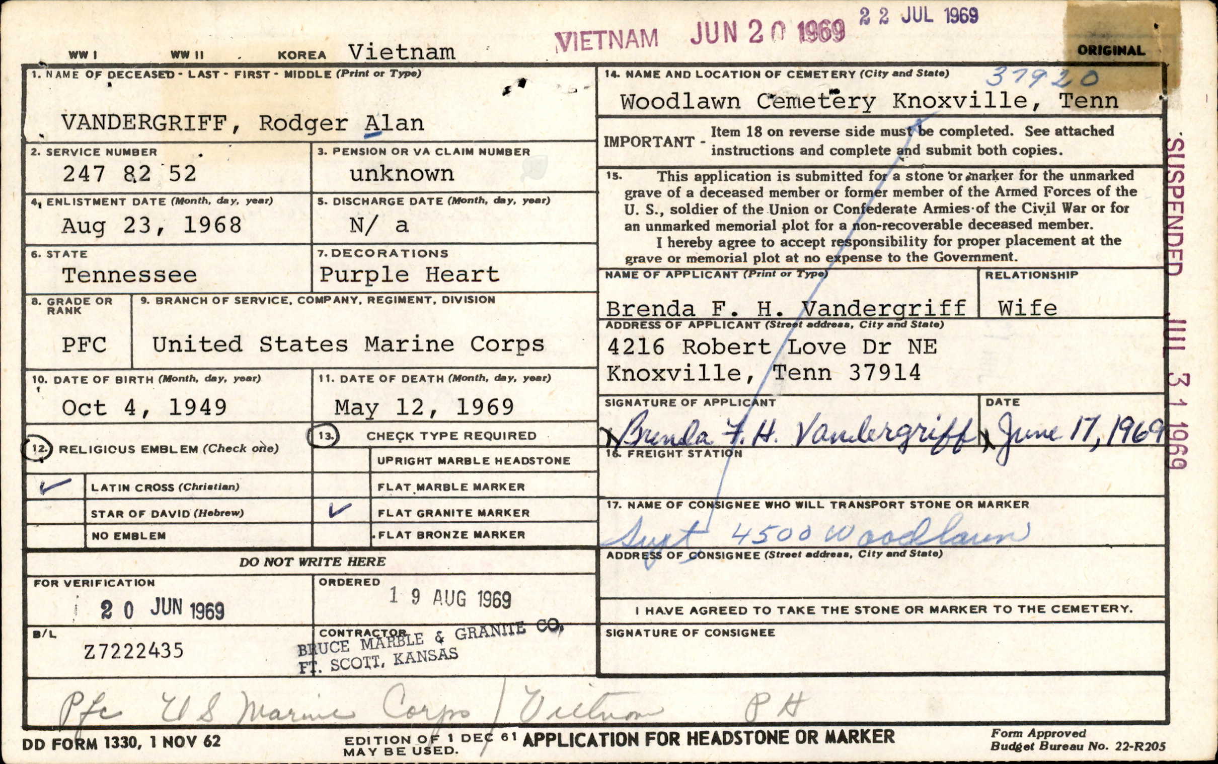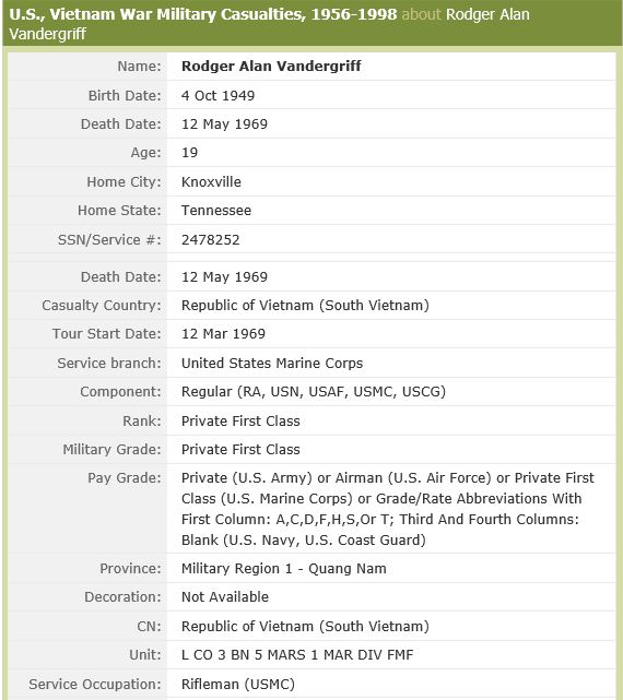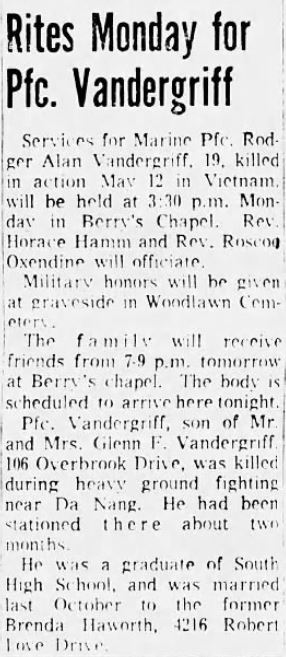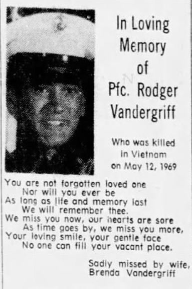 Rodger Alan Vandergriff was the son of Glenn Fredric Vandergriff and Rebecca Jane Carmichael. He was a graduate of South High School and was married in October 1968 with the former Brenda Haworth. Pfc. Vandergriff was killed during heavy ground fighting near Da Nang, Vietnam. He had been stationed there about two months.