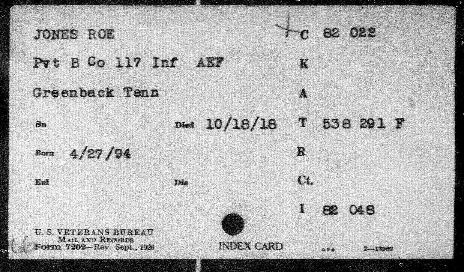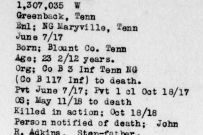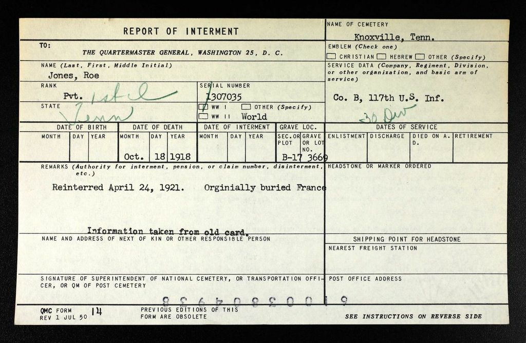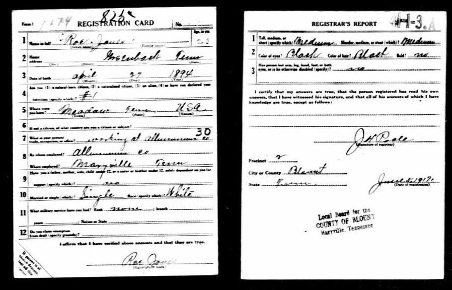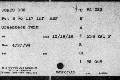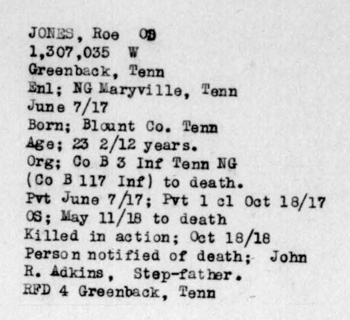Roe Jones of Greenback was born in Blount County, Tennessee. Pfc Jones was killed in action at the age of 23. He was initially buried in France.