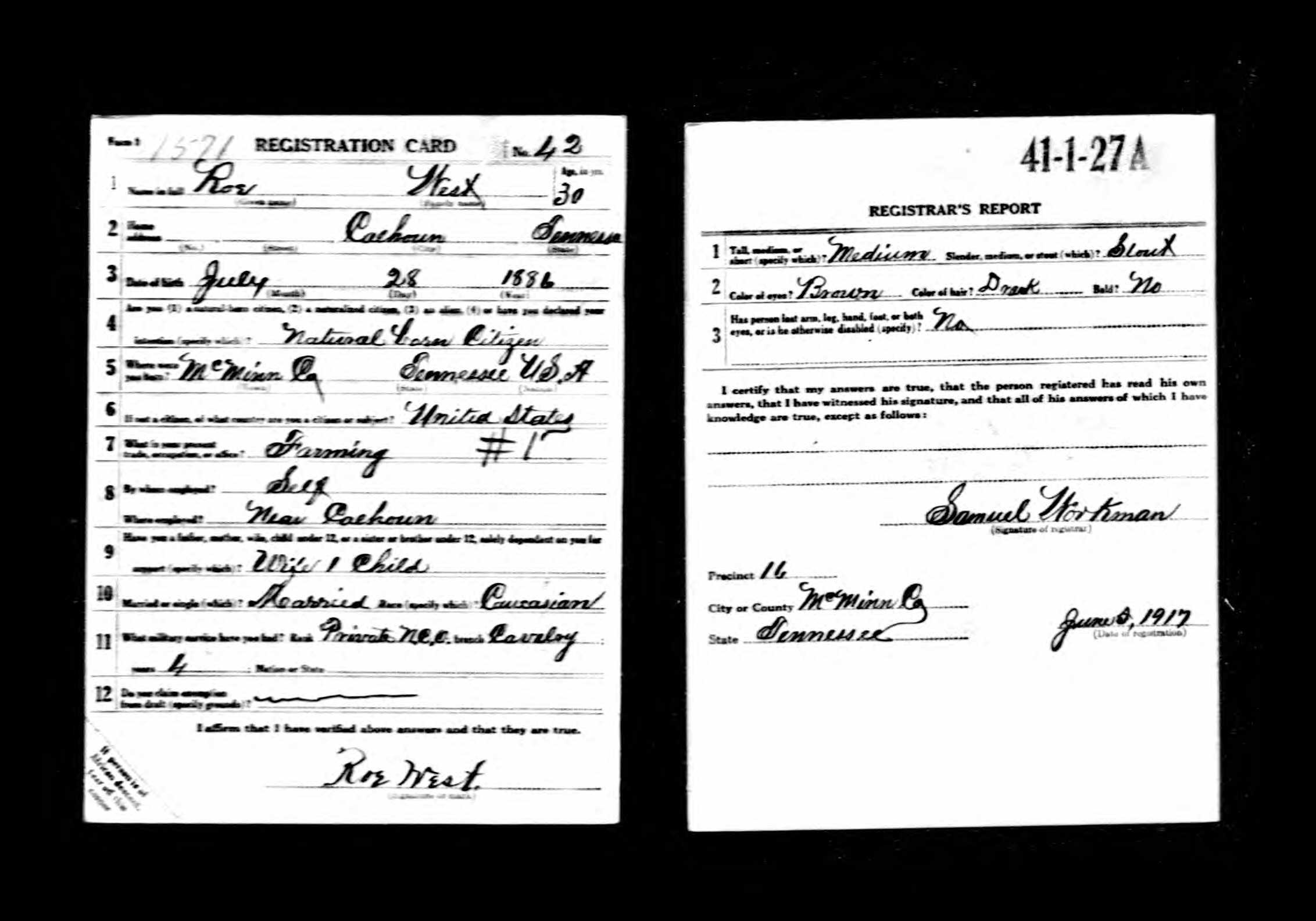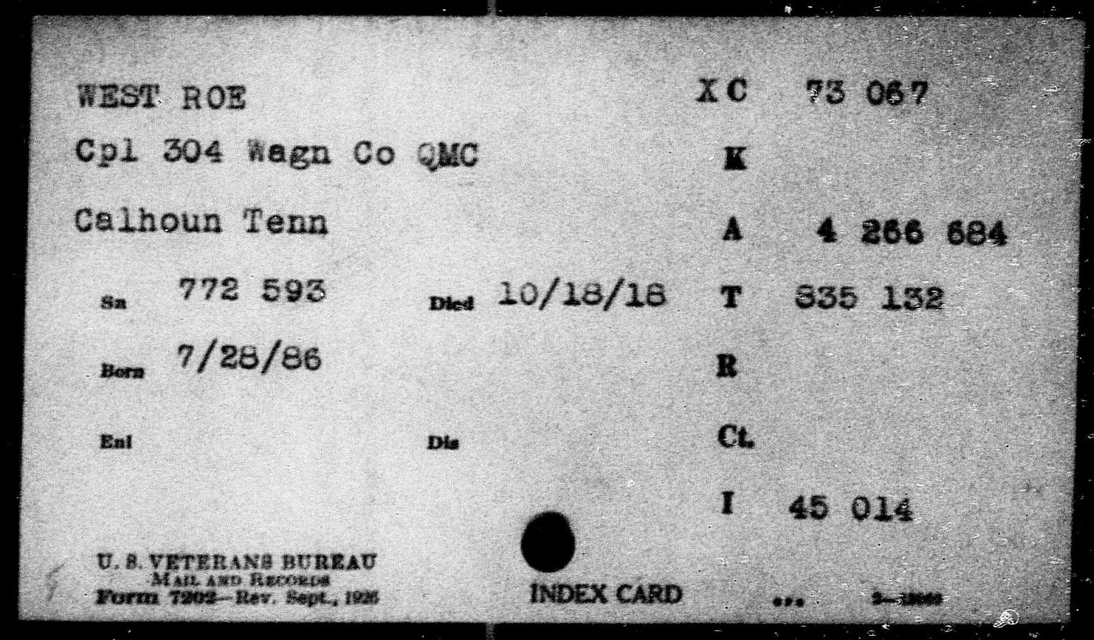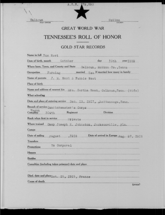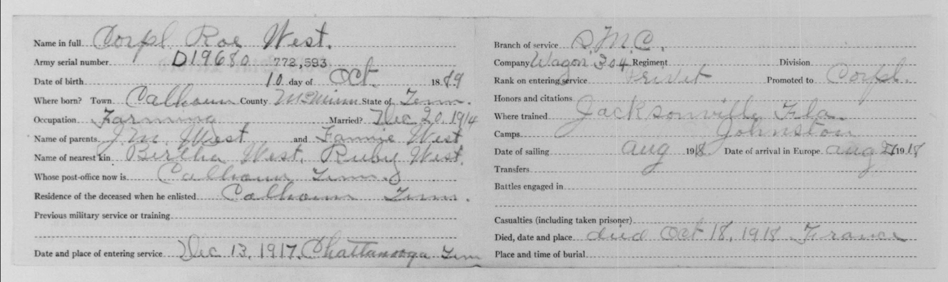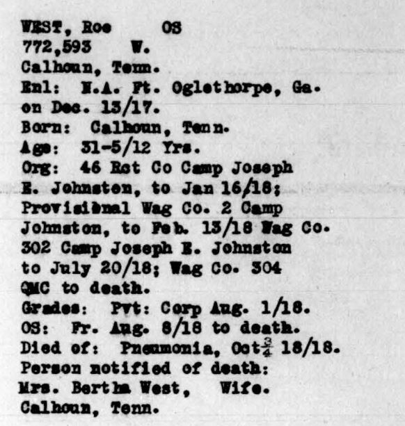 His full name was James Monroe West. He was the husband of Bertha Mae Jenkins and father of Ruby Evelyn West. He died in France of pneumonia.