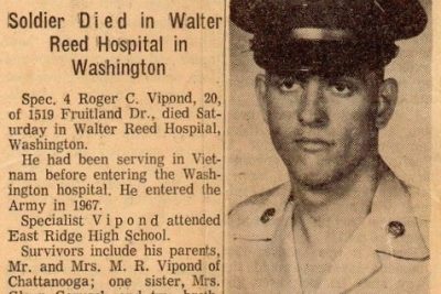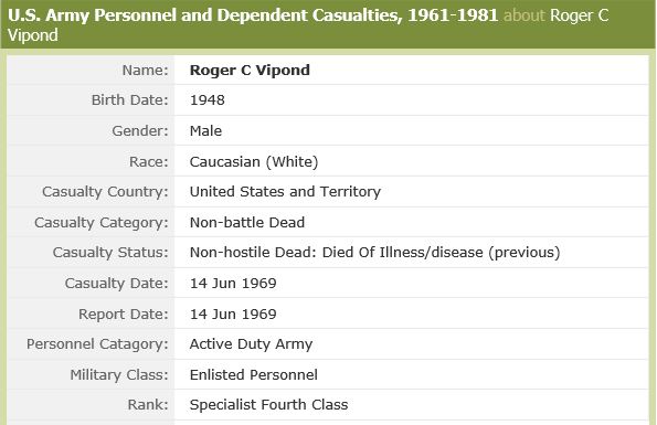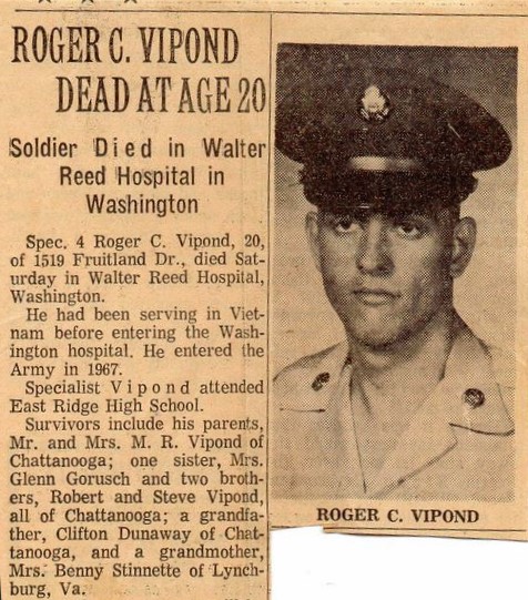 Roger Vipond, 20, died in Walter Reed hospital, Washington. He had been serving in Vietnam before entering the Washington hospital. He died of an illness and was buried at Chattanooga National Cemetery in Chattanooga, Tennessee.