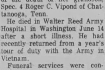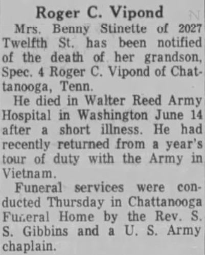 Mrs. Benny Stinette of 2027 Twelfth St. has been notified of the death of her grandson, Spec. 4 Roger C. Vipond of Chattanooga, Tenn. He died in Walter Reed Army Hospital in Washington June 14 after a short illness. He had recently returned from a year’s tour of duty with the Army in Vietnam.