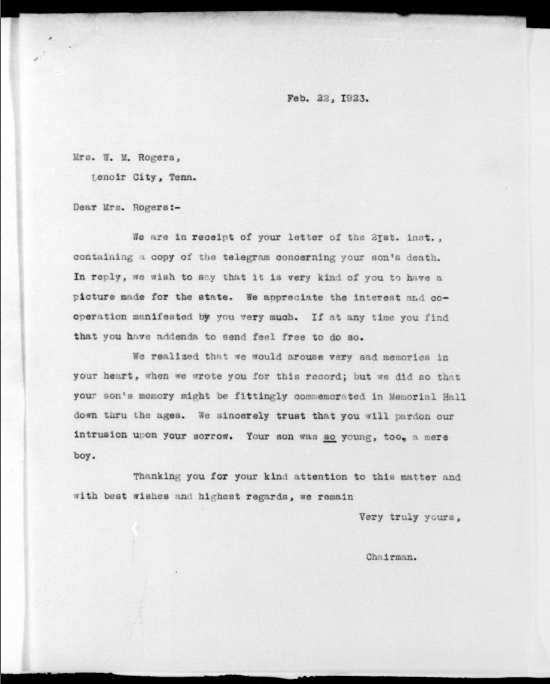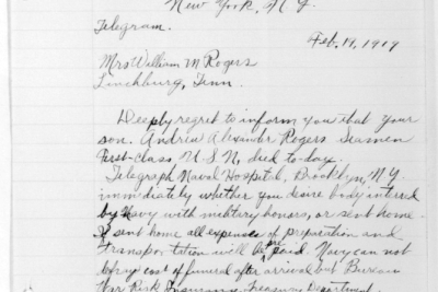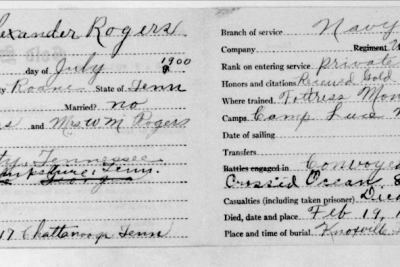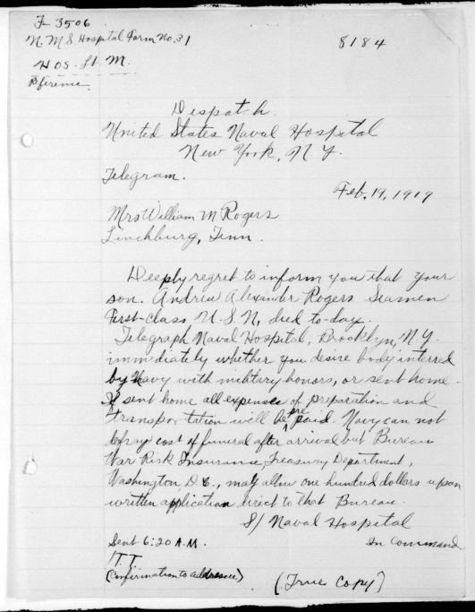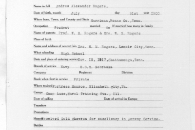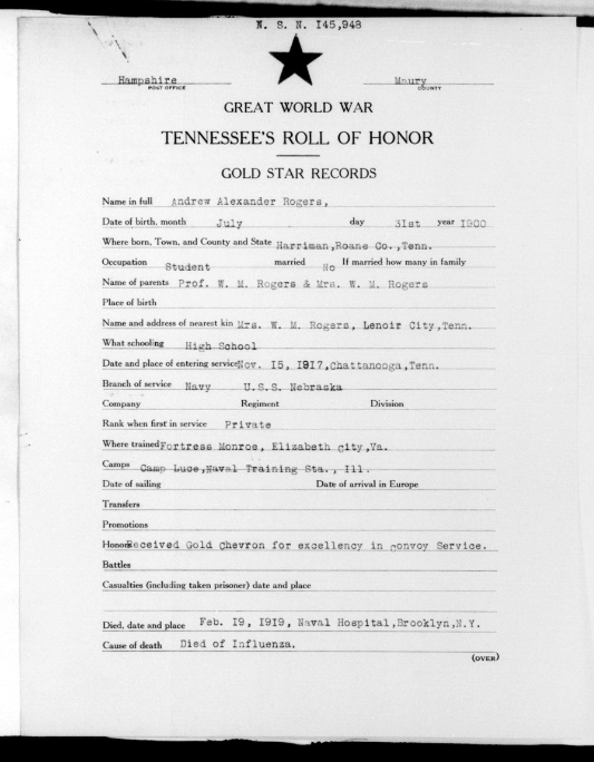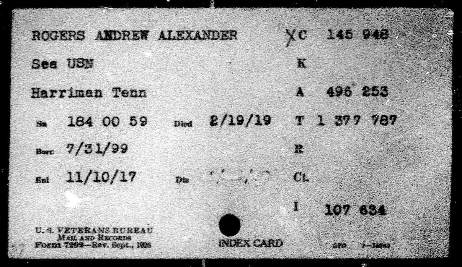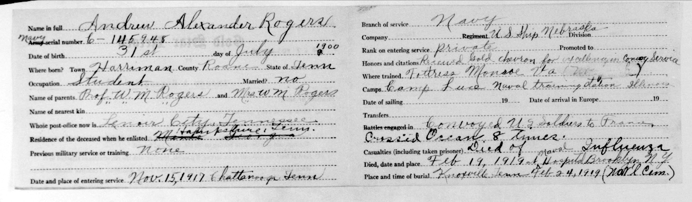 Andrew Alexander Rogers was born 31 July 1900 at Harriman, Roane County, Tn to William Marion Rogers and Lillie Elizabeth Kennedy. He entered the service November 15, 1917 at Chattanooga, Tn and trained at Fortress Monroe, Elizabeth City in Virginia and Camp Luce Naval Training Station in Illinois.