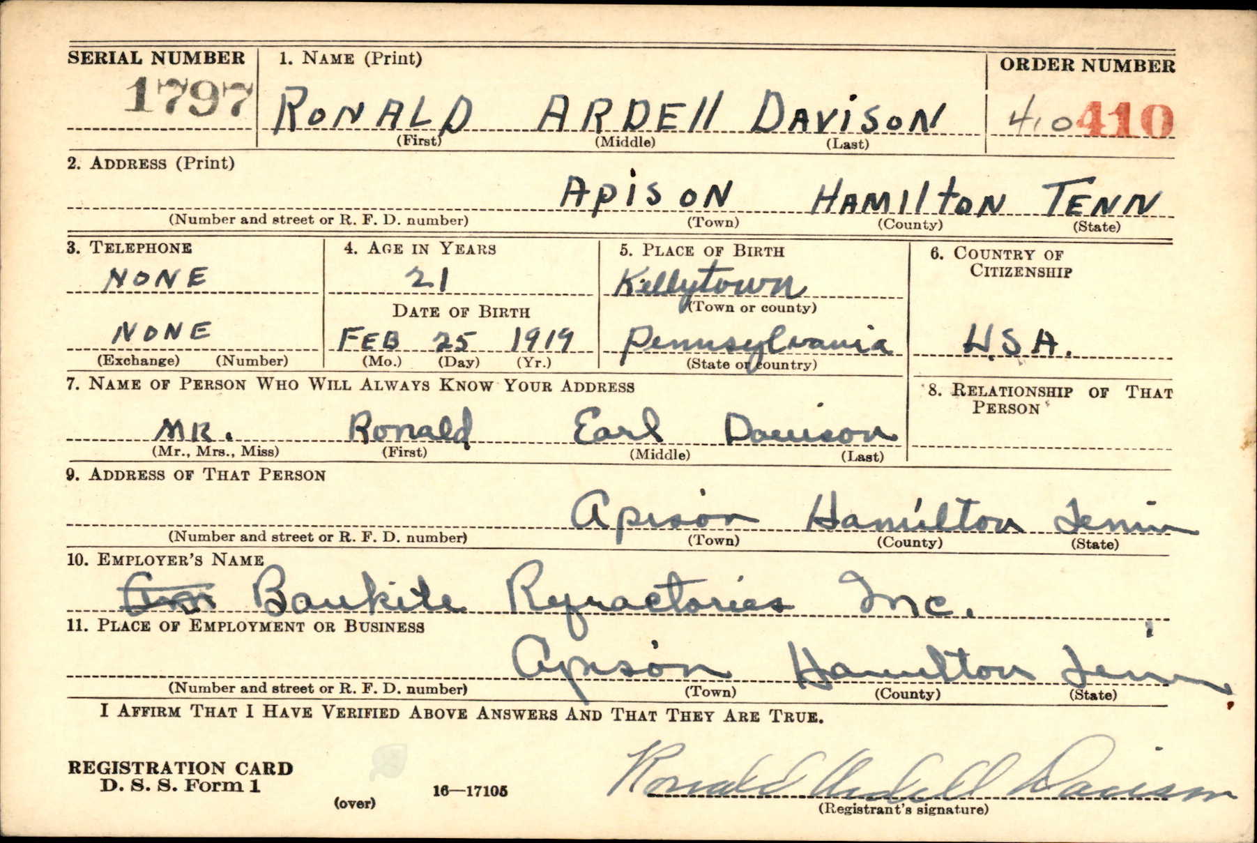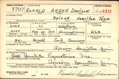 Ronald Ardell Davison was born in Kellytown, Pennsylvania to Ronald Earl Davison and Gertrude Grace Baker.