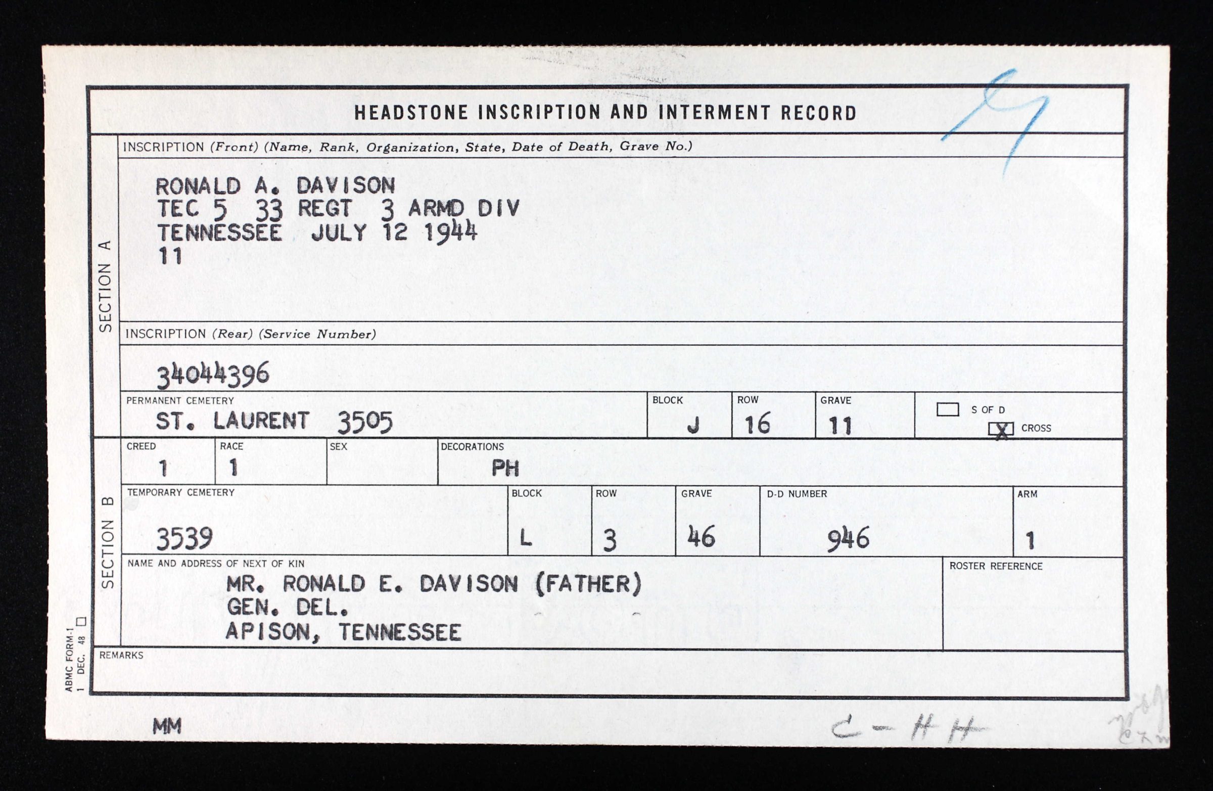 Technician 5 Ronald A. Davidson was assigned to the 33rd Armored Regiment, 3rd Armored Division. The 3rd was engaged in the Normandy campaign in July of 1944.