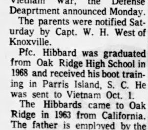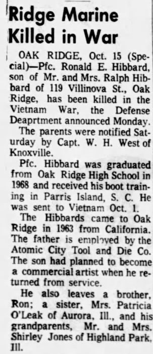 Pfc. Ronald E. Hibbard, son of Mr. and Mrs. Ralph Hibbard of 119 Villinova St., Oak Ridge, has been killed in the Vietnam War, the Defense Department announced Monday. The parents were notified Saturday by Capt. W.H. West of Knoxville. Pfc. Hibbard was graduated from Oak Ridge High School in 1968 and received his boot training in Parris Island, S.C. He was sent to Vietnam, Oct. 1. The Hibbards came to Oak Ridge in 1963 from California. The father was employed by the Atomic City Tool and Die Co. The son had planned to become a commercial artist when the returned from service. He also leaves a brother, Ron; a sister, Mrs. Patricia O’Leak of Aurora, Ill., and his grandparents, Mr. and Mrs. Shirley Jones of Highland Park, Ill.