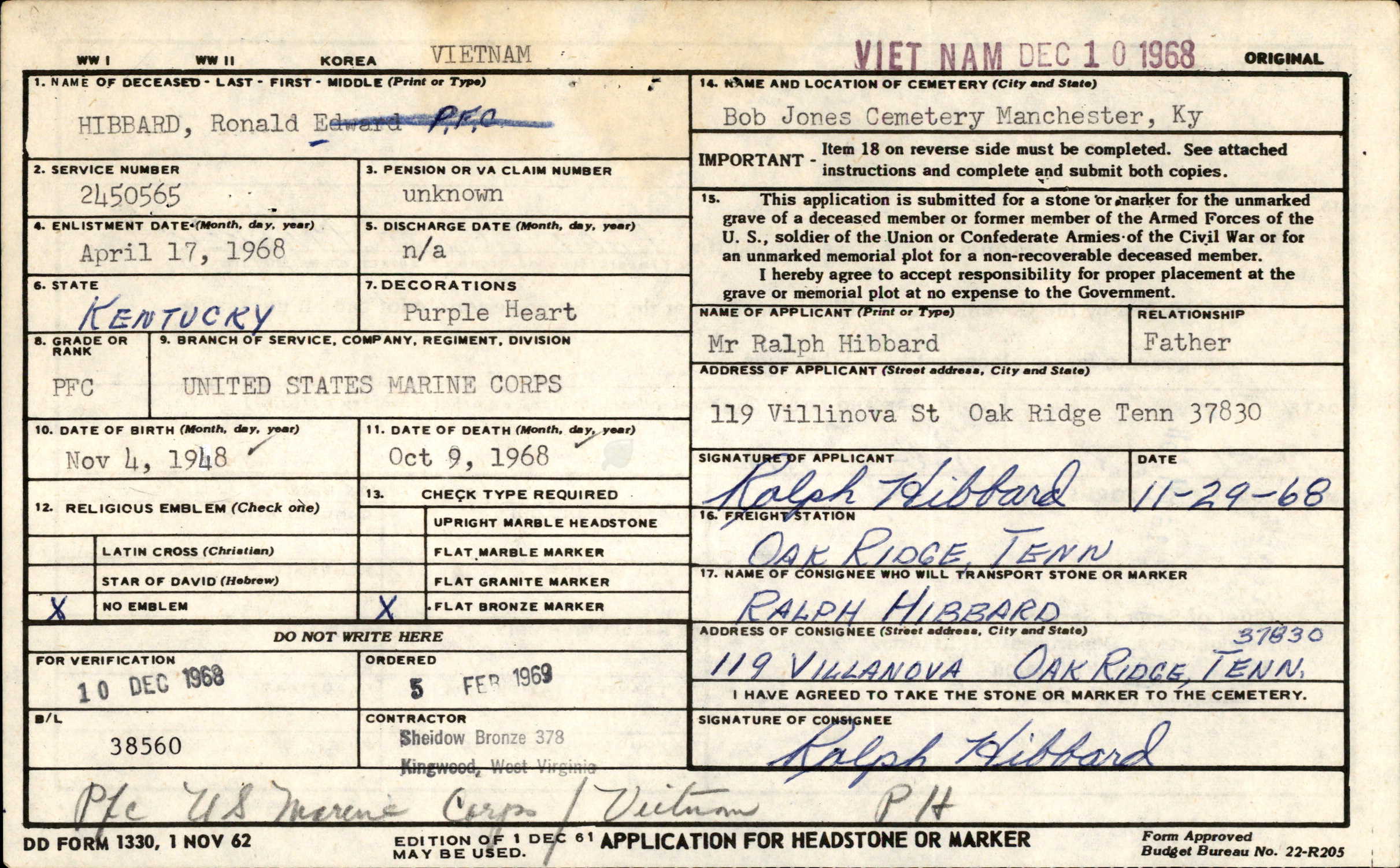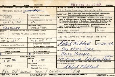 Ronald Edward Hibbard was born on 4 November 1948 at Manchester, Clay County, Kentucky. He was the son of Ralph Hibbard and Georgia Hibbard of Oak Ridge TN enlisted in the US Marine Corps on April 17 1968 in Knoxville TN. He arrived in Vietnam on September 29, 1968 and was assigned to Company D, 1st Battalion, 3d Marines, 3d MARDIV (Rein) FMF.