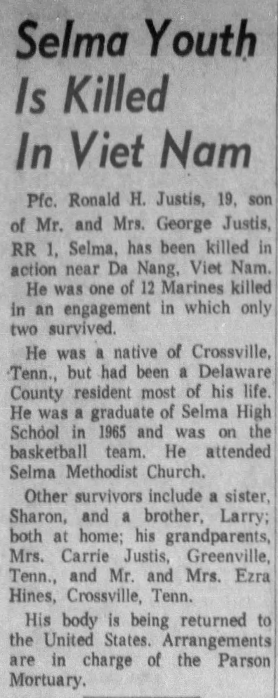 Ronald Henry Justis was a native of Crosville, Tenn, but had been a Delaware County resident most of his life. He was a graduate of Selma High School in 1965 and was on the basketball team. He attended Selma Methodist Church.