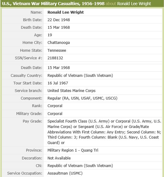 Corporal Ronald Lee Wright was born on December 22, 1948, and was originally from Chattanooga, Tennessee. He served his country in the Vietnam War in the United States Marine Corps, as an antitank assaultman in 3rd CAG, Combined Action, III MAF. His tour began on July 16, 1967. On March 15, 1968, Cpl. Wright was killed in Quang Tri province, South Vietnam, under hostile conditions; he was 19 years old at the time of his death. He is memorialized on the Vietnam Veterans Memorial on Panel 44E, Line 60.