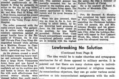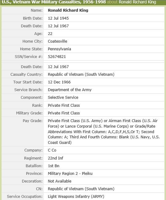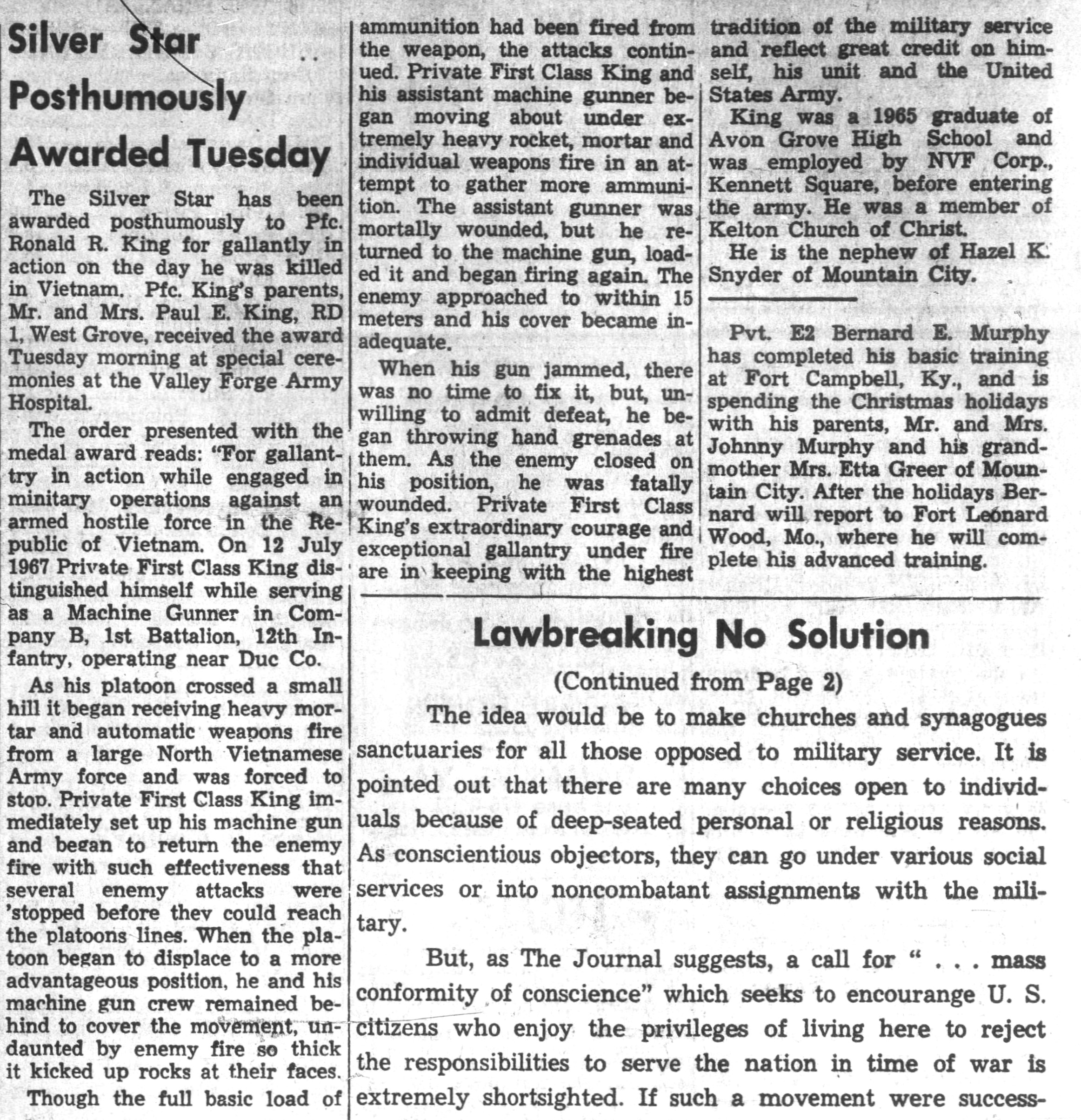 The Silver Star has been awarded posthumously to Pfc. Ronald R. King for gallanty in action on the day he was killed in Vietnam. Pfc. King’s parents, Mr. and Mrs. Paul E. King, RD 1, West Grove, received the award at special ceremonies at the Valley Forge Army Hospital. The order presented with the medal award reads: “For gallantry in action while engaged in military operations against an armed hostile force in the Republic of Vietnam. On 12 July 1967 Private First Class King distinguished himself while serving as a Machine Gunner in Company B, 1st Battalion, 12th Infantry, operating near Duc Co. As his platoon crossed a small hill it began receiving heavy mortar and automatic weapons fire from a large North Vietnamese Army force and was forced to stop. Private First Class King immediately began to return the enemy fire with such effectiveness that several enemy attacks were stopped before they could reach the platoons lines. When the platoon began to displace to a more advantageous position, he and his machine gun crew remained behind to cover the movement, undaunted by enemy fire so thick it kicked up rocks at their faces. Though the full basic load of ammunition had been fired from the weapon, the attacks continued. Private First Class King and his assistant machine gunner began moving about under extremely heavy rocket, mortar and individual weapons fire in an attempt to gather more ammunition. The assistant gunner was mortally wounded, but he returned to the machine gun, loaded it and began firing again. The enemy approached to within 15 meters and his cover became inadequate. When his gun jammed, there was not time to fix it, but, unwilling to admit defeat, he began throwing hand grenades at them. As the enemy closed on his position, he was fatally wounded. Private First Class King’s extraordinary courage and exceptional gallantry under fire are in keeping with the highest tradition of the military service and reflect great credit on himself, his unit and the United States Army.”