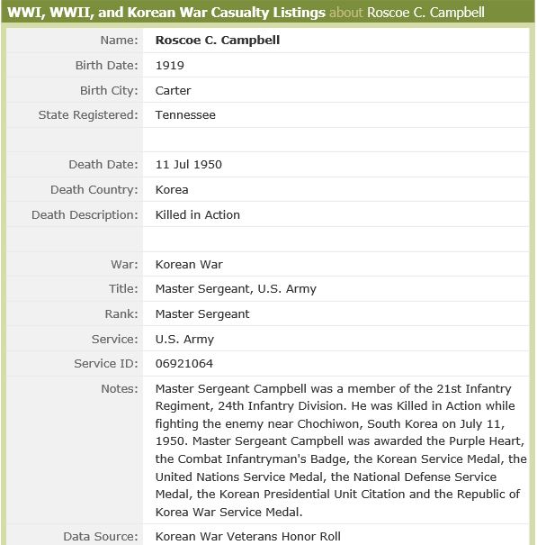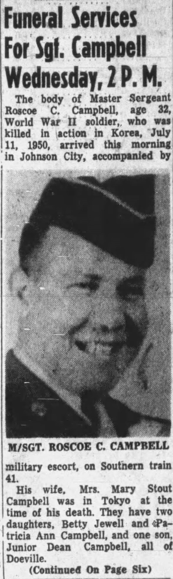 The body of Master Sergeant Roscoe C. Campbell, age 32, killed in action in Korea, July 11, 1950, arrived this morning in Johnson City, accompanied by military escort, on Southern train 41. His wife, Mrs. Mary Stout Campbell was in Tokyo at the time of his death. They have two daughters, Betty Jewell and Patricia Ann Campbell, and one son, Junior Dean Campbell, all of Doeville.