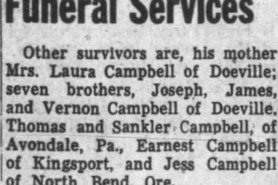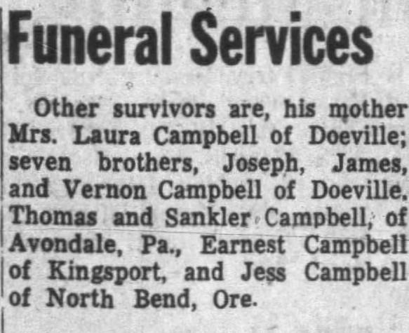 Other survivors are his mother, Mrs. Laura Campbell of Doeville; seven brothers, Joseph, James and Vernon Campbell of Doeville, Thomas and Sankler Campbell, of Avondale, Pa., Earnest Campbell of Kingsport, and Jess Campbell of North Bend, Ore.