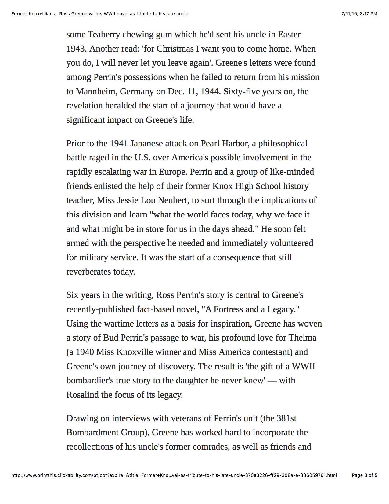 After Perrin was sent overseas and assigned to a B-17 crew in the 532nd Bomb Squad of the 381st Bomb Group, Greene, who was too young to write, began dictating letters to his mother to be sent to his uncle.