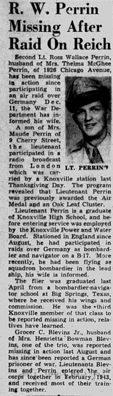 2nd Lt Ross W. Perrin Jr., Bombardier, Knoxville, Tn. KIA.