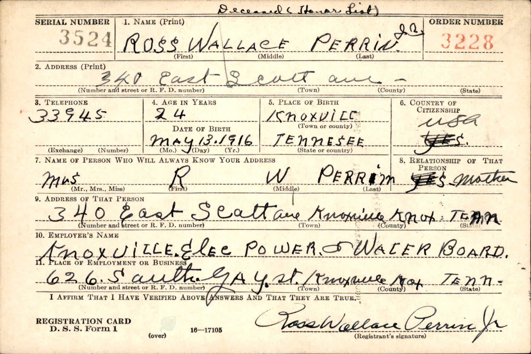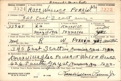 He was born on May 13, 1916, in Knoxville to Ross W. Perrin Sr. and Maude Margaret Foster Perrin. He had two siblings-Evelyn Mae Perrin Greene and Marjorie Perrin. He graduated from Knoxville High School in the Class of 1935.