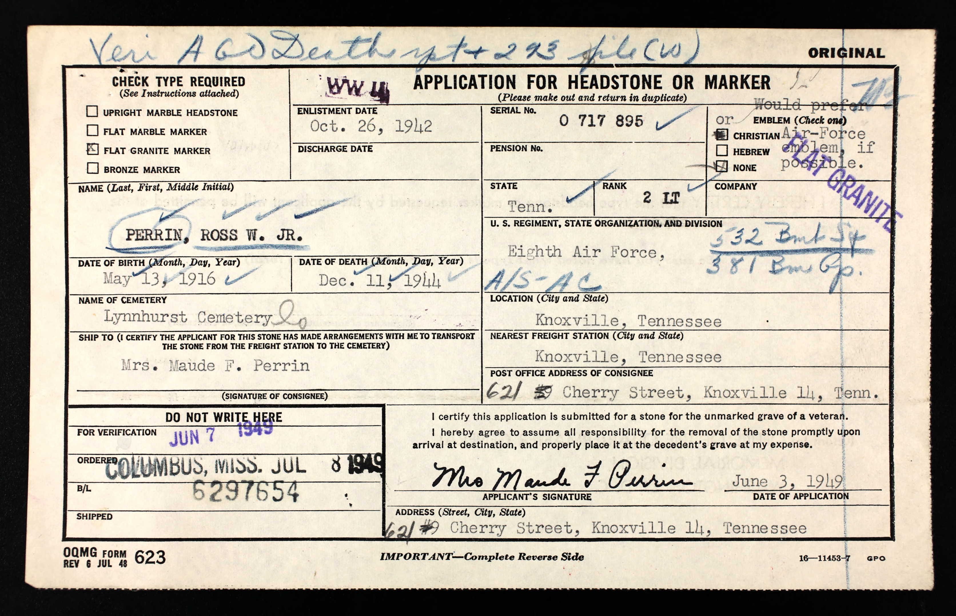 When the crew remains were uncovered, Perrin was first buried in Frankfurt, Germany, then in Avold, France, and finally, in 1949, he was returned to Knoxville and interred in Lynnhurst Cemetery.