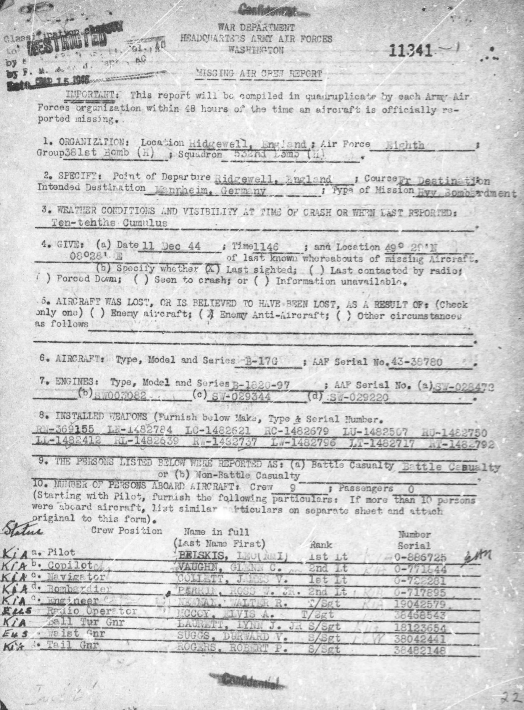 On the 11th of December 1944 the assigned mission was to Mannheim, Germany. While on this mission the aircraft was shot down by flak. Of the crew, seven were killed in this action and two became Prisoners of War.