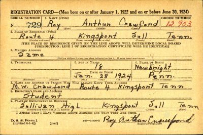 Roy Arthur Crawford was born in 1924 in Newbnight, Pennsylvania to William Matt Crawford and Ida Leota Arnold. He attended Sullivan High School for one year.