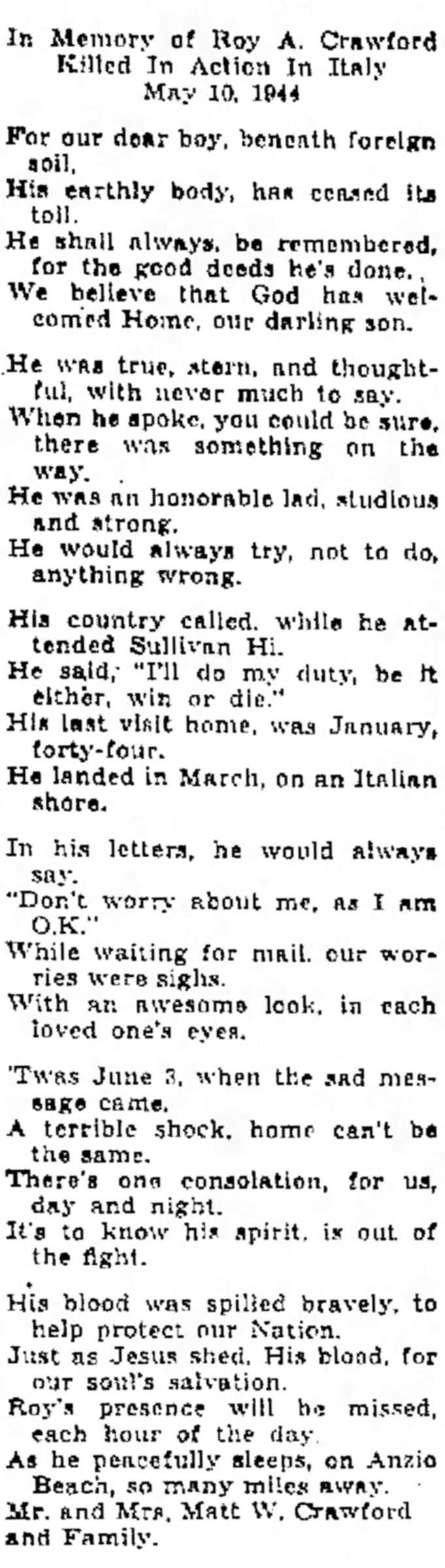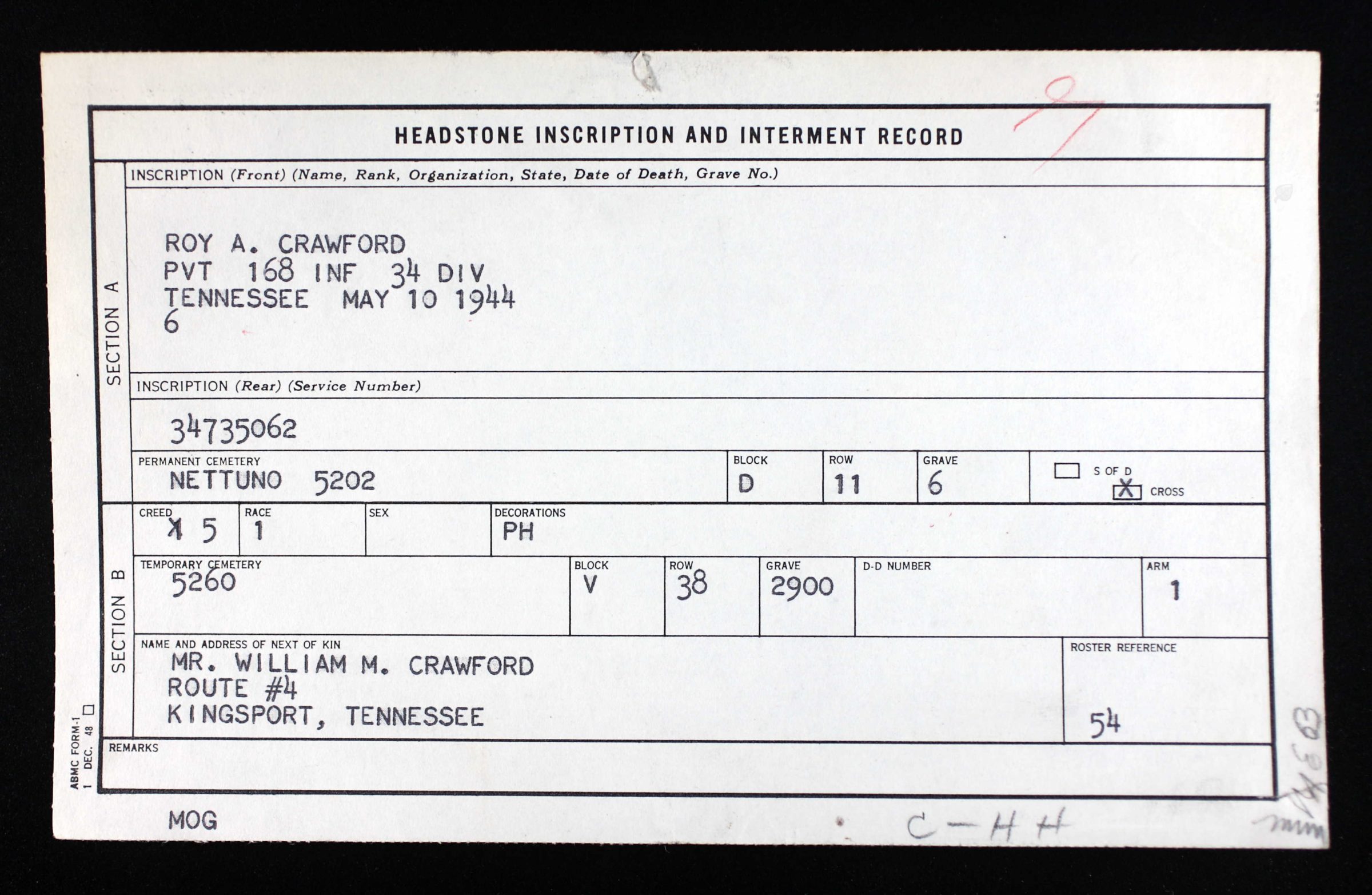 Private Crawford was killed in action on 10 May 1944 and was interred at Sicily-Rome American Cemetery, Nettuno, Italy, located at D,11,6.