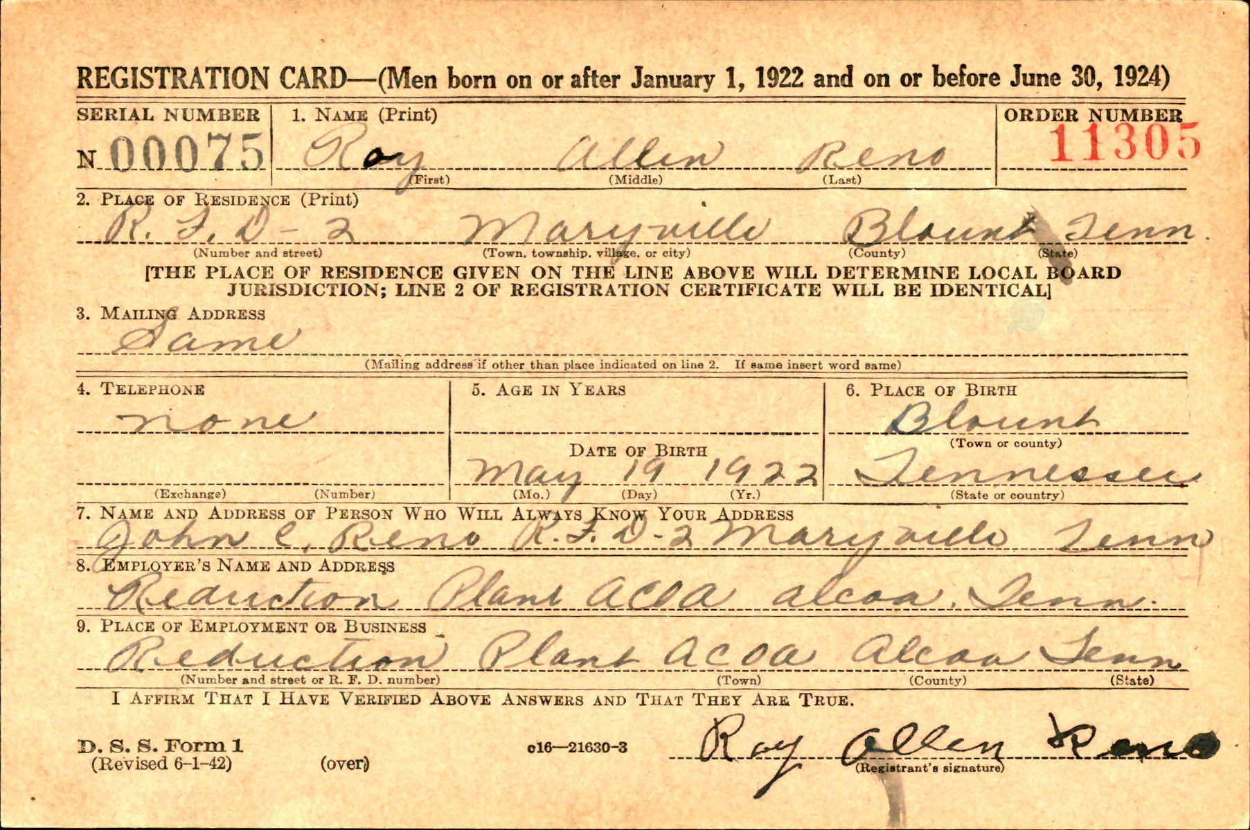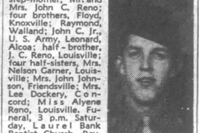 Survivors: father and step-mother, Mr. and Mrs. John C. Reno; four brothers, Floyd of Knoxville; Raymond of Walland; John C Jr., U.S. Army; Leonard of Alcoa; half-brother, J.C. Reno of Louisville; four half-sisters, Mrs. Nelson Garner of Louisville; Mrs. John Johnson of Friendsville; Mrs. Lee Dockery of Concord and Miss Alyene Reno of Louisville.