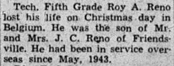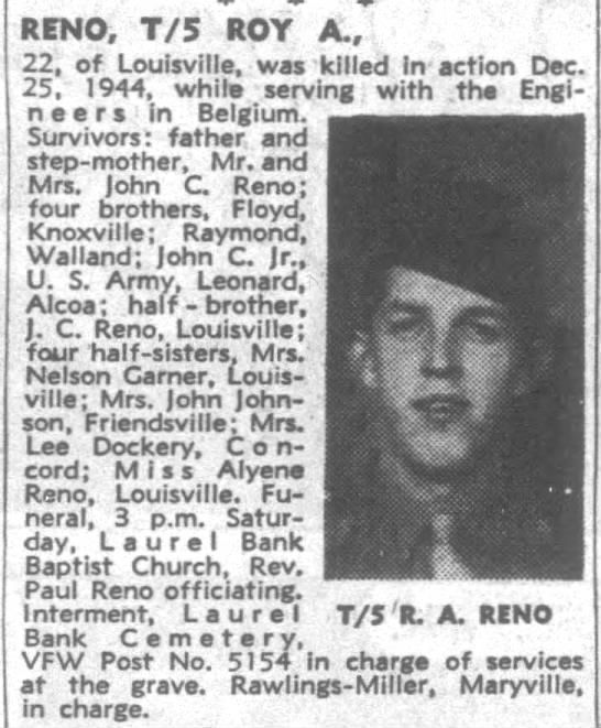 T/5 Roy A. Reno of Louisville, was killed in action Dec. 25, 1944, while serving with the Engineers in Belgium.