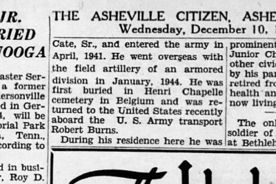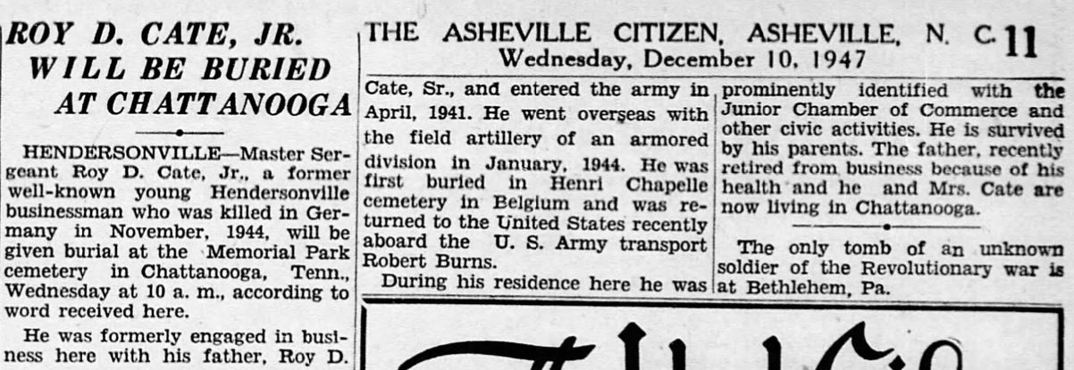 Master Sergeant Roy D. Cate Jr., a former well known young Henderson businessman who was killed in Germany in November, 1944, will be given burial at the Memorial Park cemetery in Chattanooga, Tenn. He was formerly engaged in business here with his father, Roy D. Cate Sr., and entered the army in April, 1941. He went overseas with the field artillery of an armored division in January, 1944. He was first buried in Henri Chapelle cemetery in Belgium and was returned to the United States recently aboard the U.S. Army transport Robert Burns. During his residence here he was prominently identified with the Junior Chamber of Commerce and other civic activities. He is survived by his parents. The father, recently retired from business because of his health and he and Mrs. Cate are now living in Chattanooga.