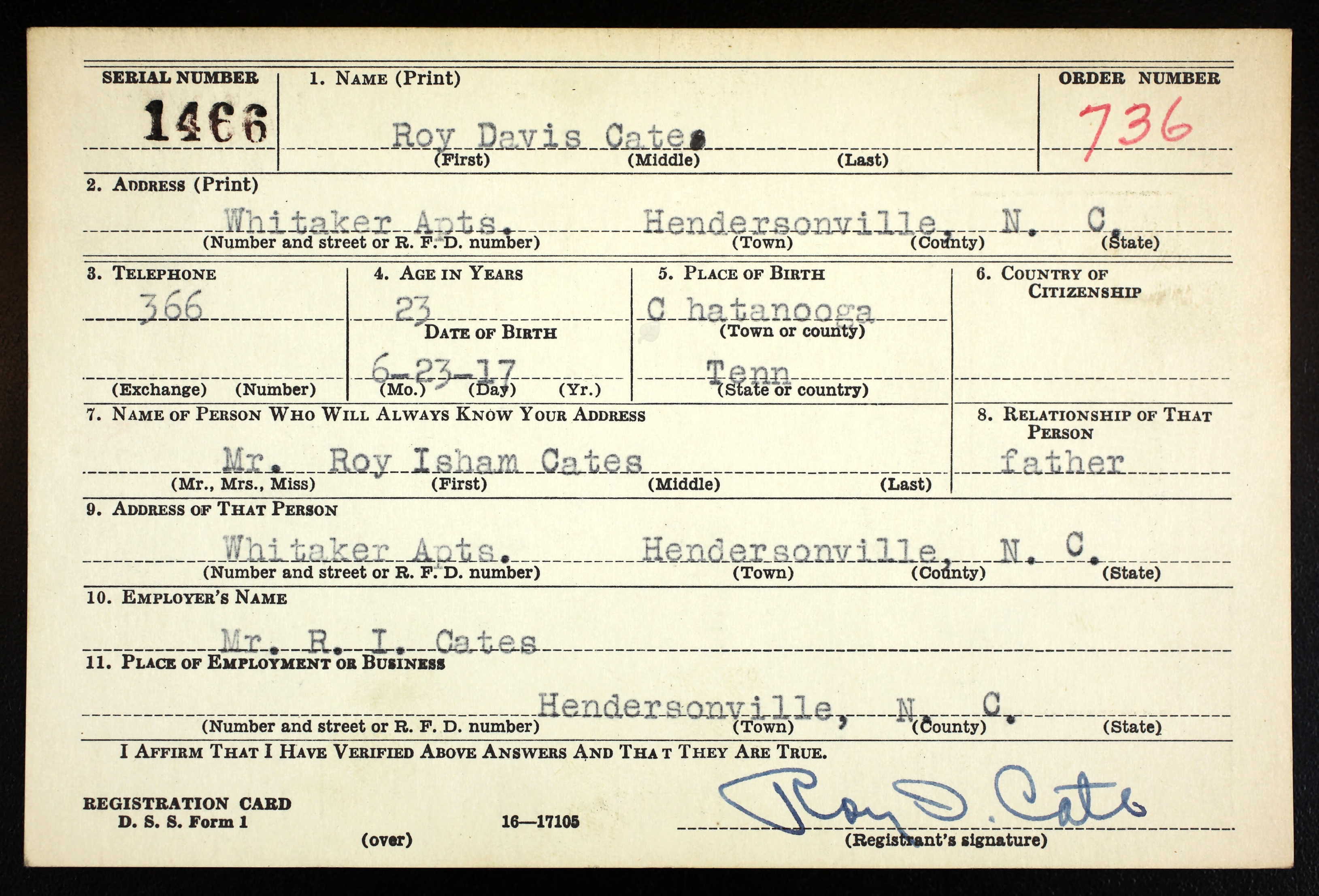 Roy Davis Cate was born on 23 June 1917 at Chattanooga, Tennessee to Roy Isham Cate and Ruby Davis.