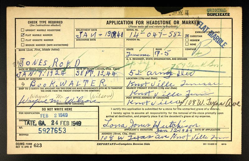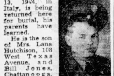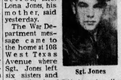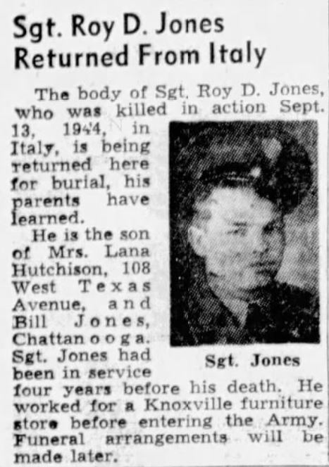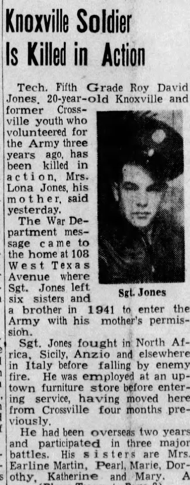 Tech, Fifth Grade Roy David Jones, 20-year-old Knoxville and former Crossville youth who volunteered for the Army three years ago, has been killed in action, Mrs. Lona Jones, his mother, said yesterday. The War Department message came to the home at 108 West Texas Avenue where Sgt. Jones left six sisters and a brother in 1941 to enter the Army with his mother’s permission. Sgt. Jones fought in North Africa, Sicily, Anzio and elsewhere in Italy before falling by enemy fire. He was employed at an uptown Furniture store before entering service, having moved here from Crossville four months previously. He had been overseas two years and participated in three major battles. His sisters are, Mrs. Earline Martin, Pearl, Mary, Dorothy, Katherine and Mary. A young brother, Ernest, also survives.